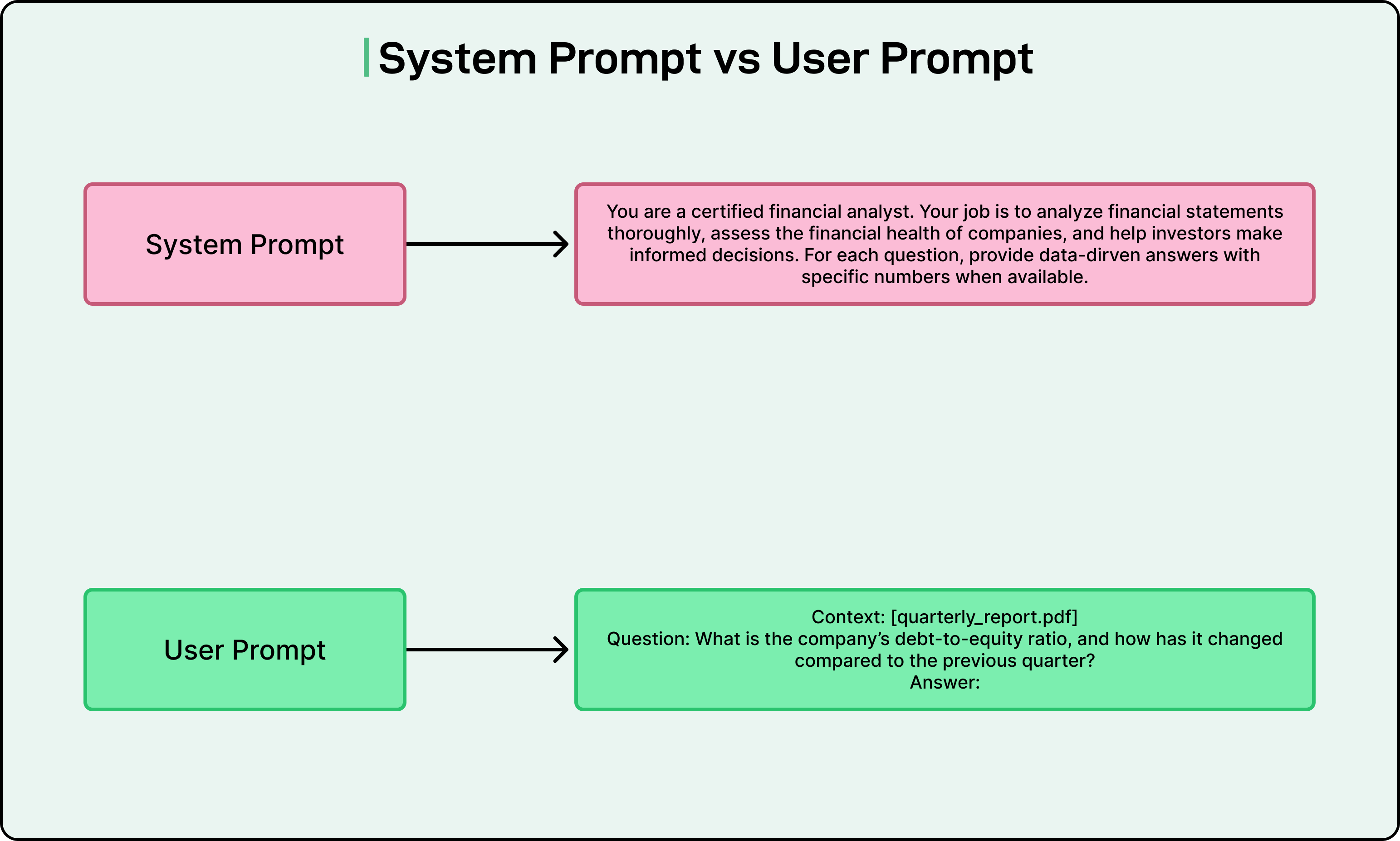 On the other hand, user prompts contain the actual task or question. For instance, if we are building a chatbot that helps buyers understand property disclosures, the system prompt might instruct the model to act as an experienced real estate agent, while the user prompt contains the specific question about a property.