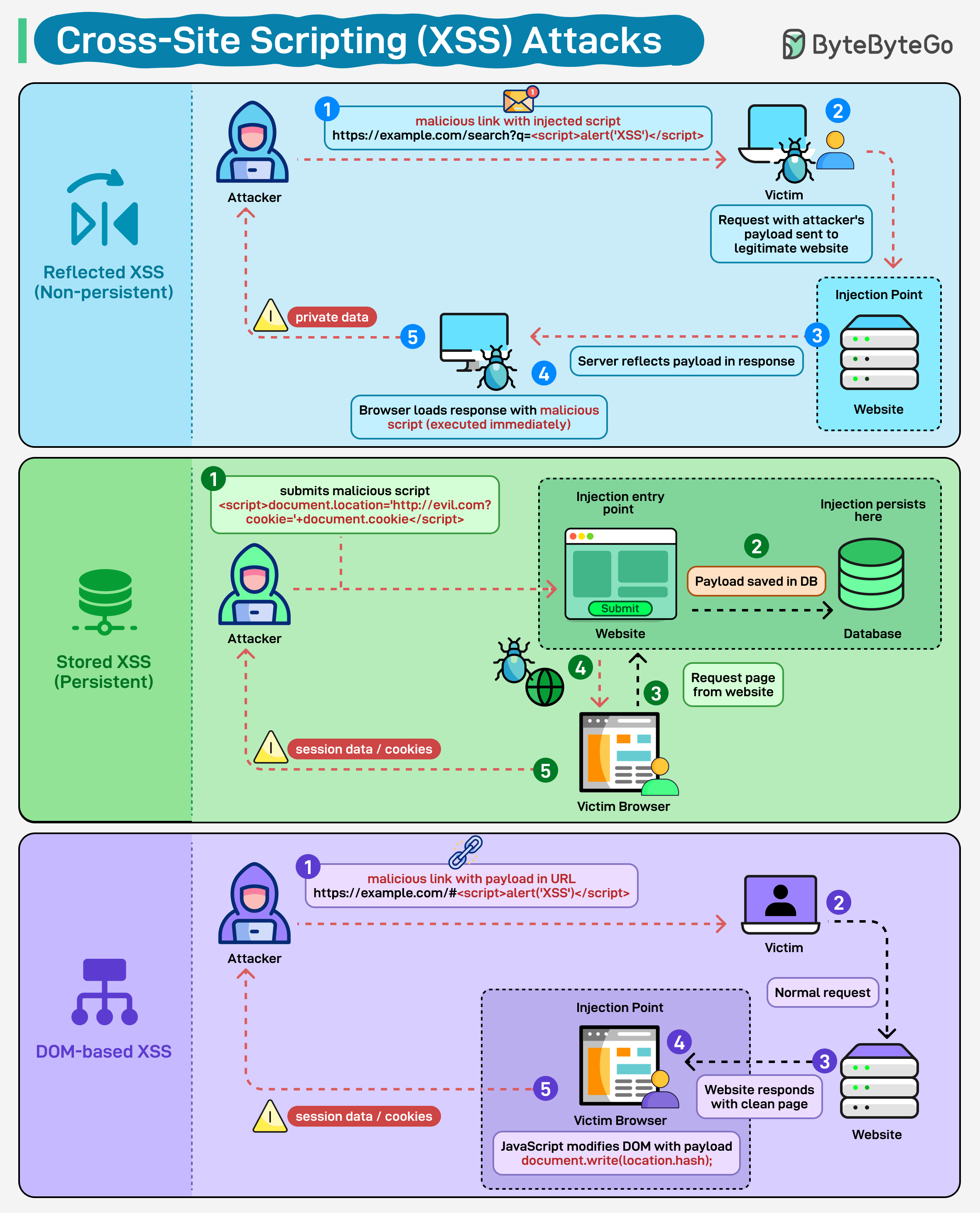 Stored XSS: The malicious code gets saved in your database, maybe in a comment field or user profile. Then it runs automatically every time someone loads that page.