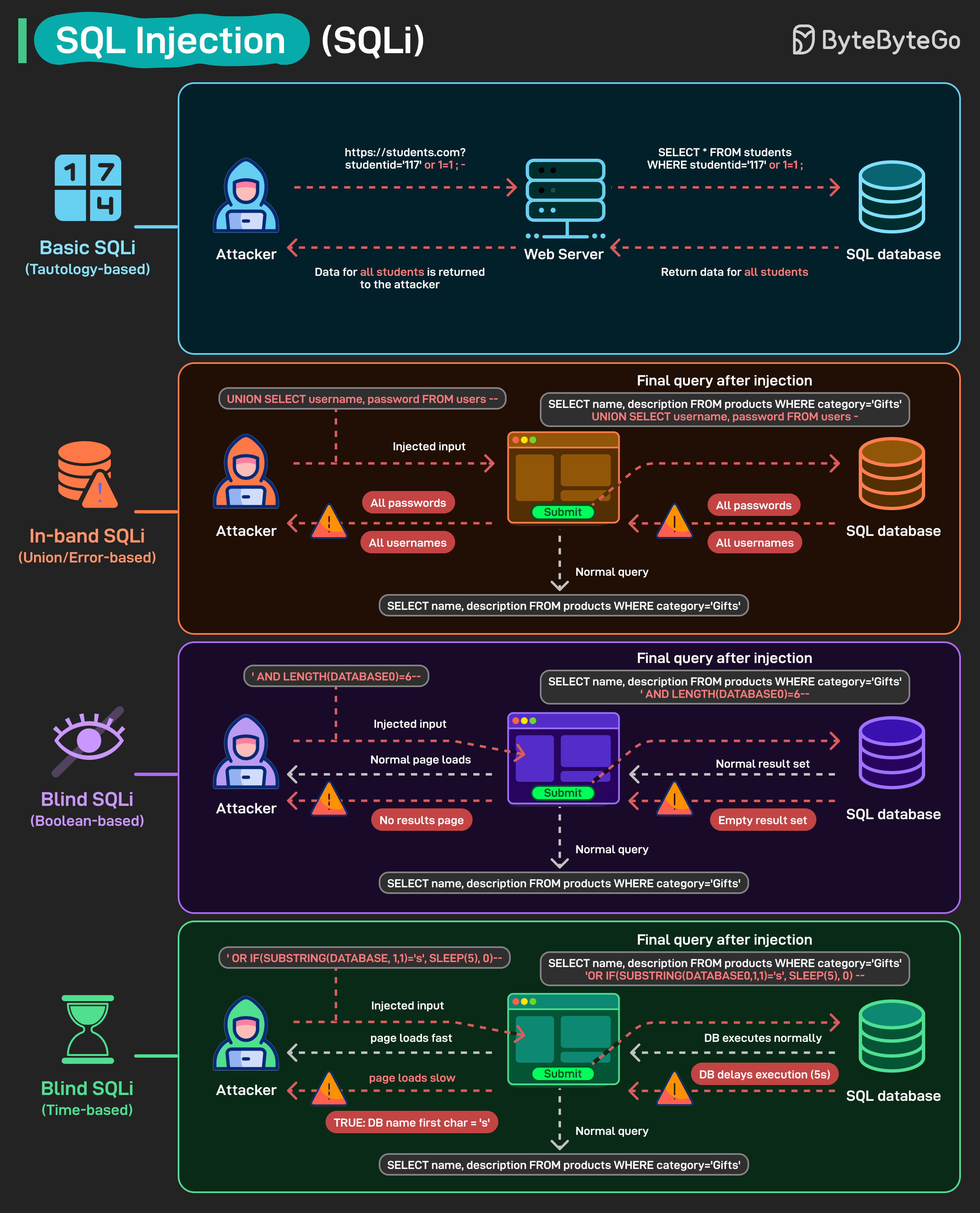 Blind SQLi (Time-based): Attackers use commands like SLEEP(5) to measure server response delays and extract data incrementally.