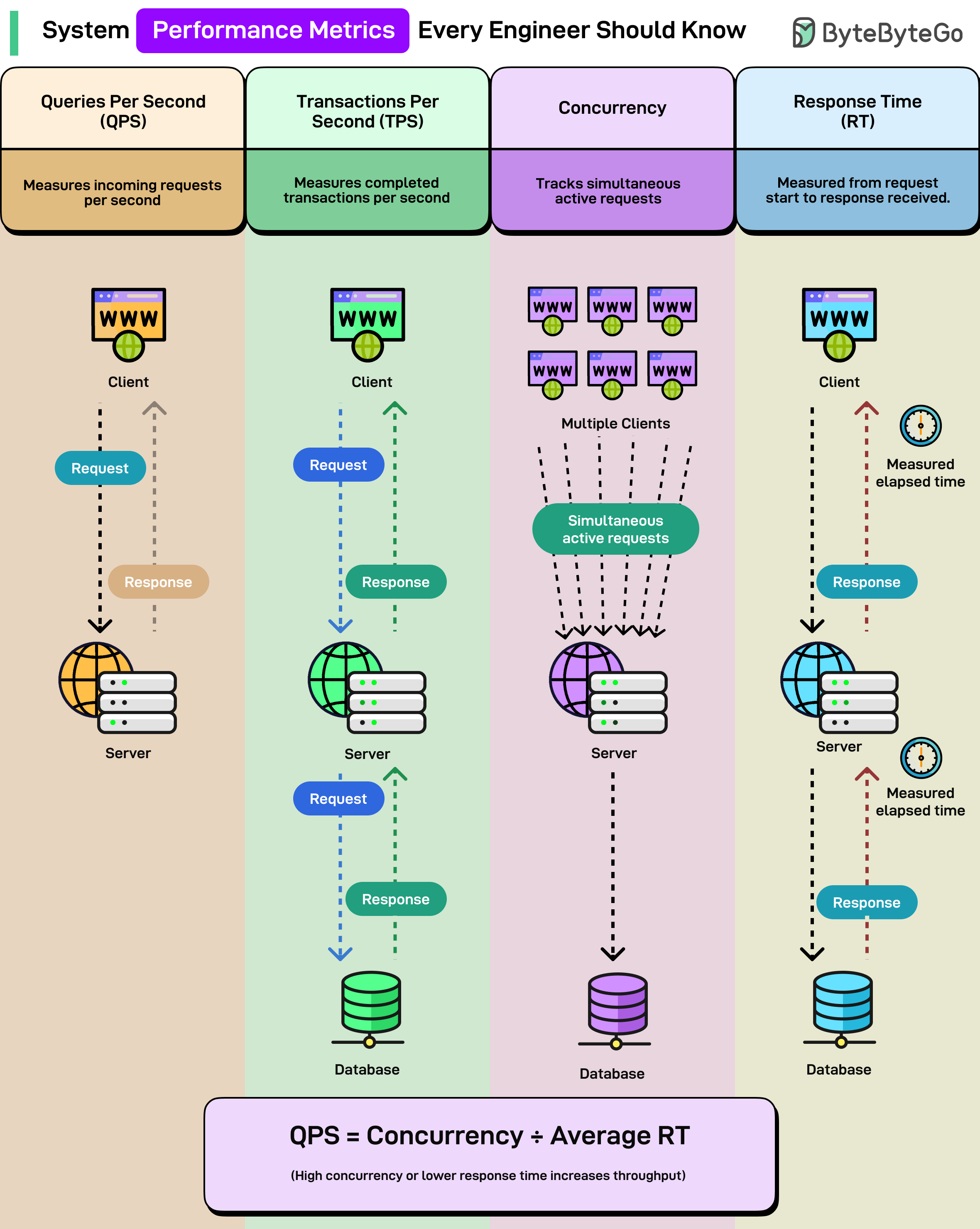 Queries Per Second (QPS): How many incoming requests your system handles per second. Your server gets 1,000 requests in one second? That's 1,000 QPS. Sounds straightforward until you realize most systems can't sustain their peak QPS for long without things starting to break.