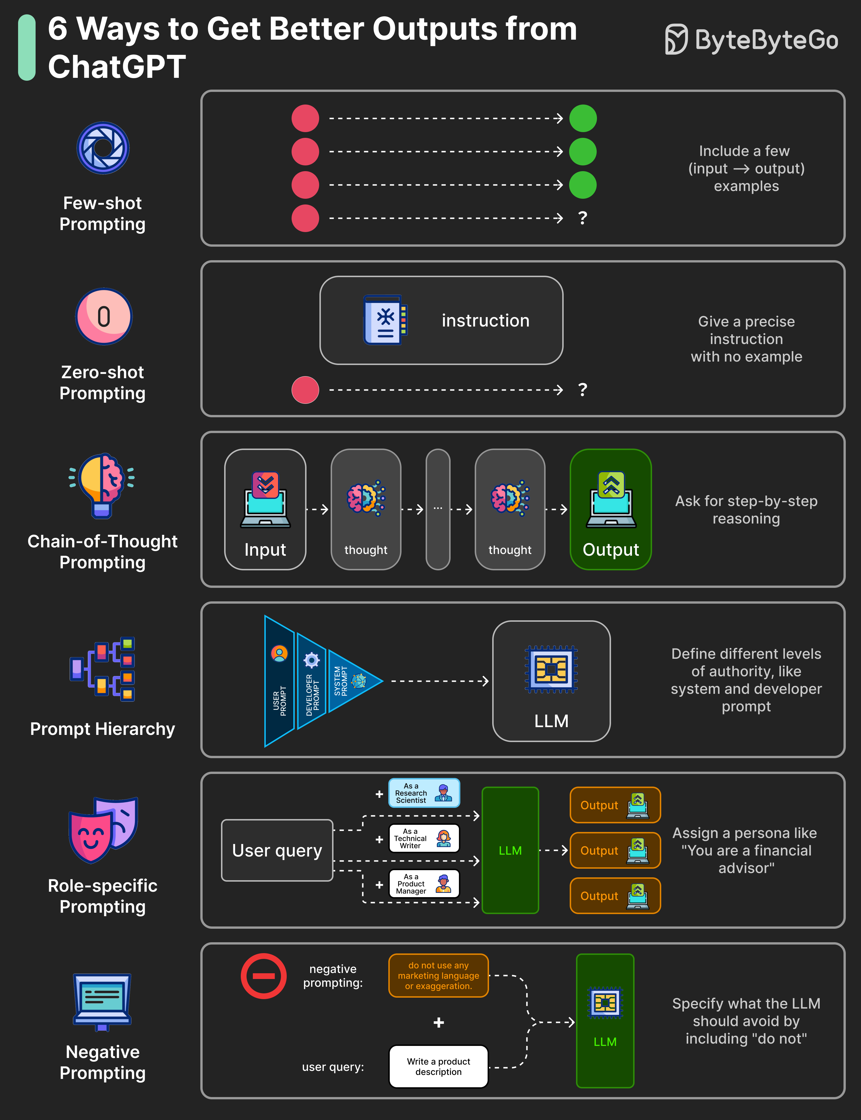 Prompt Hierarchy: Define system, developer, and user instructions with different levels of authority. System prompts define high-level goals and set guardrails, while developer prompts define formatting rules and customize the LLM’s behavior.