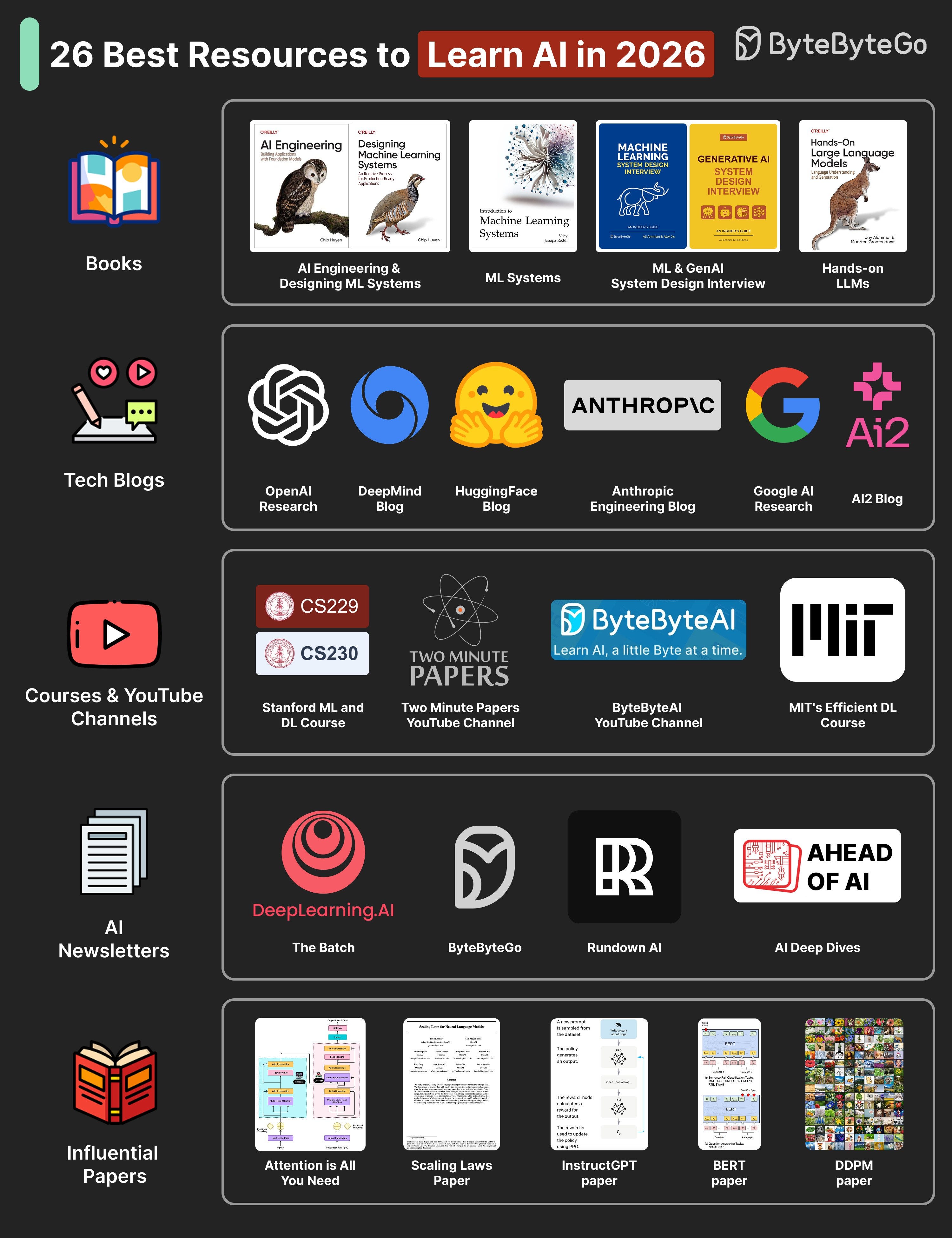 Subscribe to The Batch (Deeplearning. ai), ByteByteGo, Rundown AI, and Ahead of AI to learn about major AI updates, model releases, and research highlights.Influential Research Papers