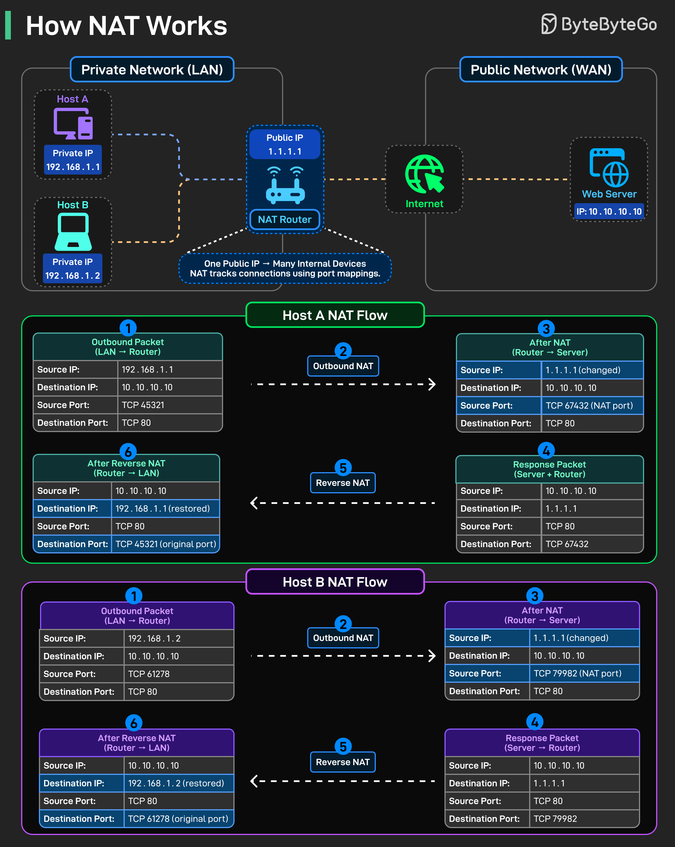 That magic is handled by NAT (Network Address Translation), one of the silent workhorses of modern networking. It’s the reason IPv4 hasn’t run out completely, and why your router can hide dozens of devices behind a single public IP.
