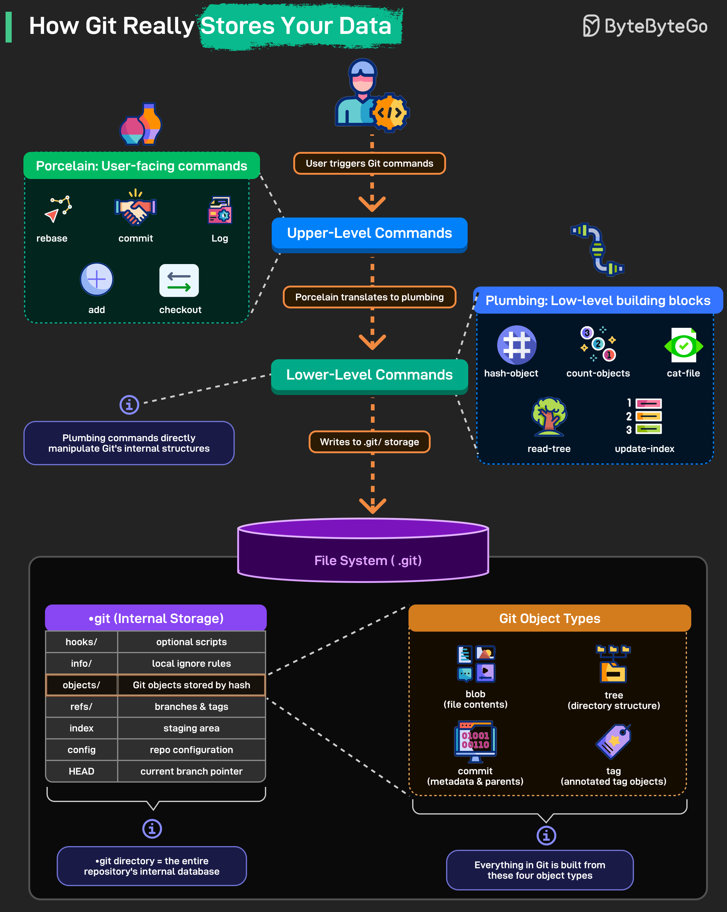 Plumbing writes directly into the .git directory (Git’s entire internal database)
