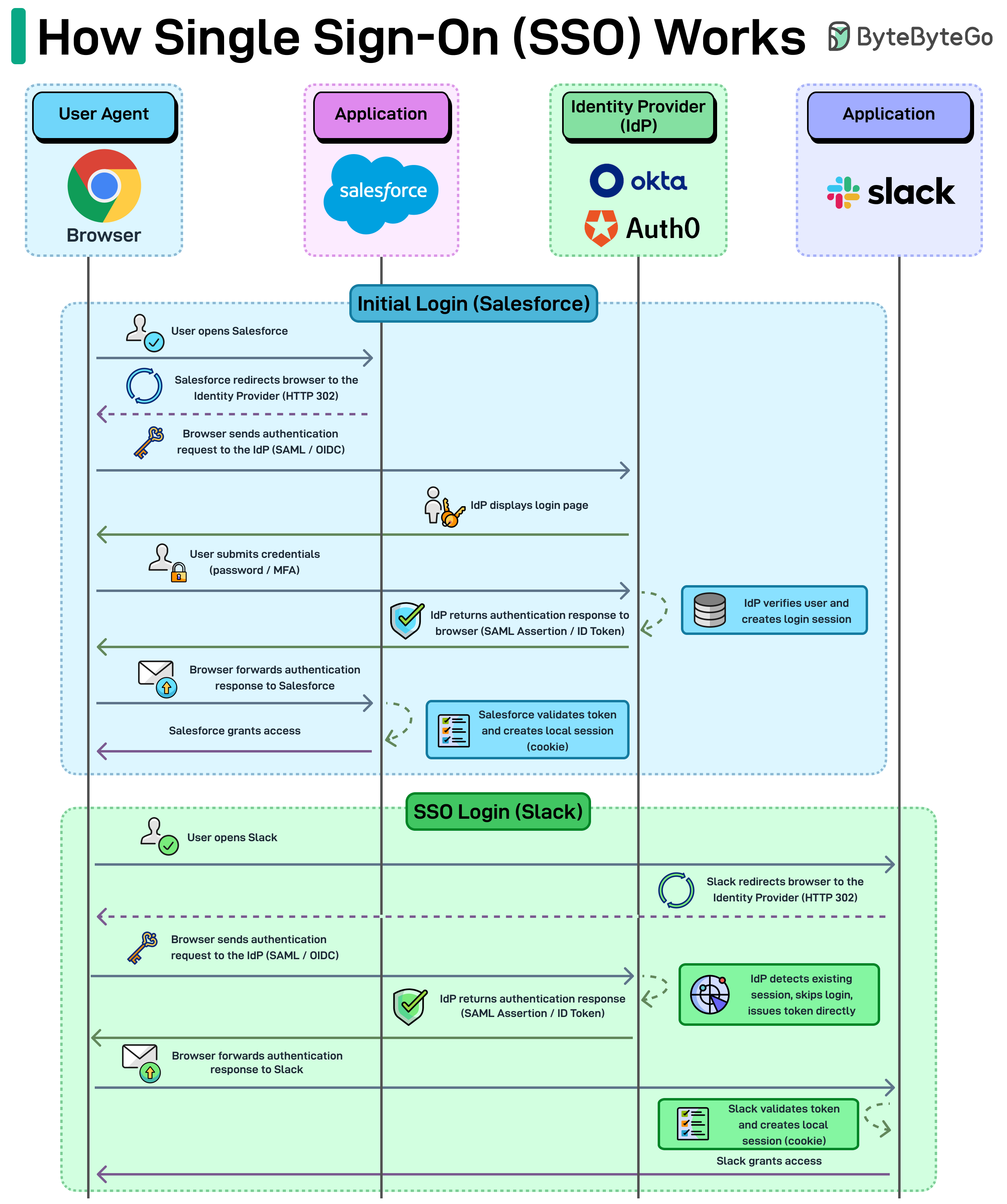 Once verified, the IdP creates a login session and sends back an authentication response (a SAML assertion or ID token) through the browser.