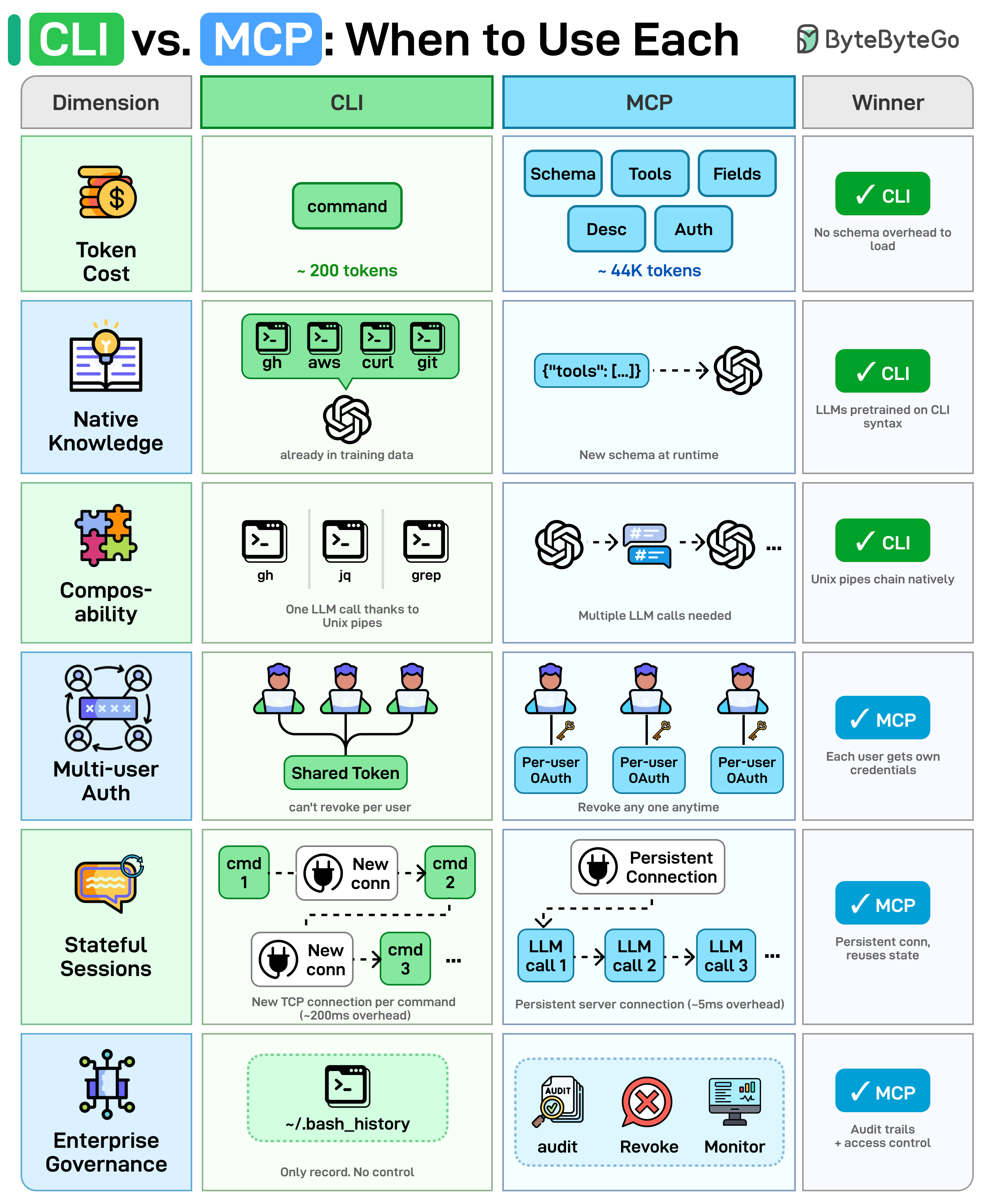 Enterprise Governance: CLI's only audit trail is ~/.bash_history. MCP provides structured audit logs, access revocation, and monitoring built into the protocol.