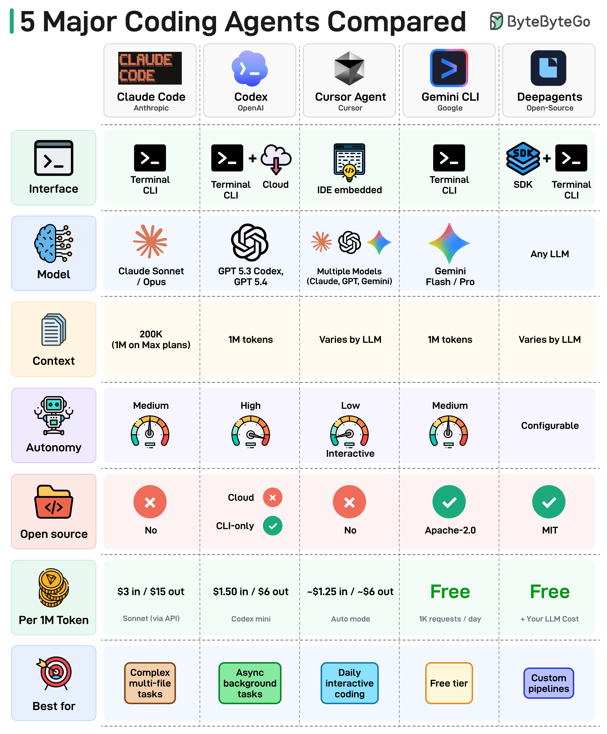 The diagram below compares the 5 leading agents across interface, model, context window, autonomy, and more.