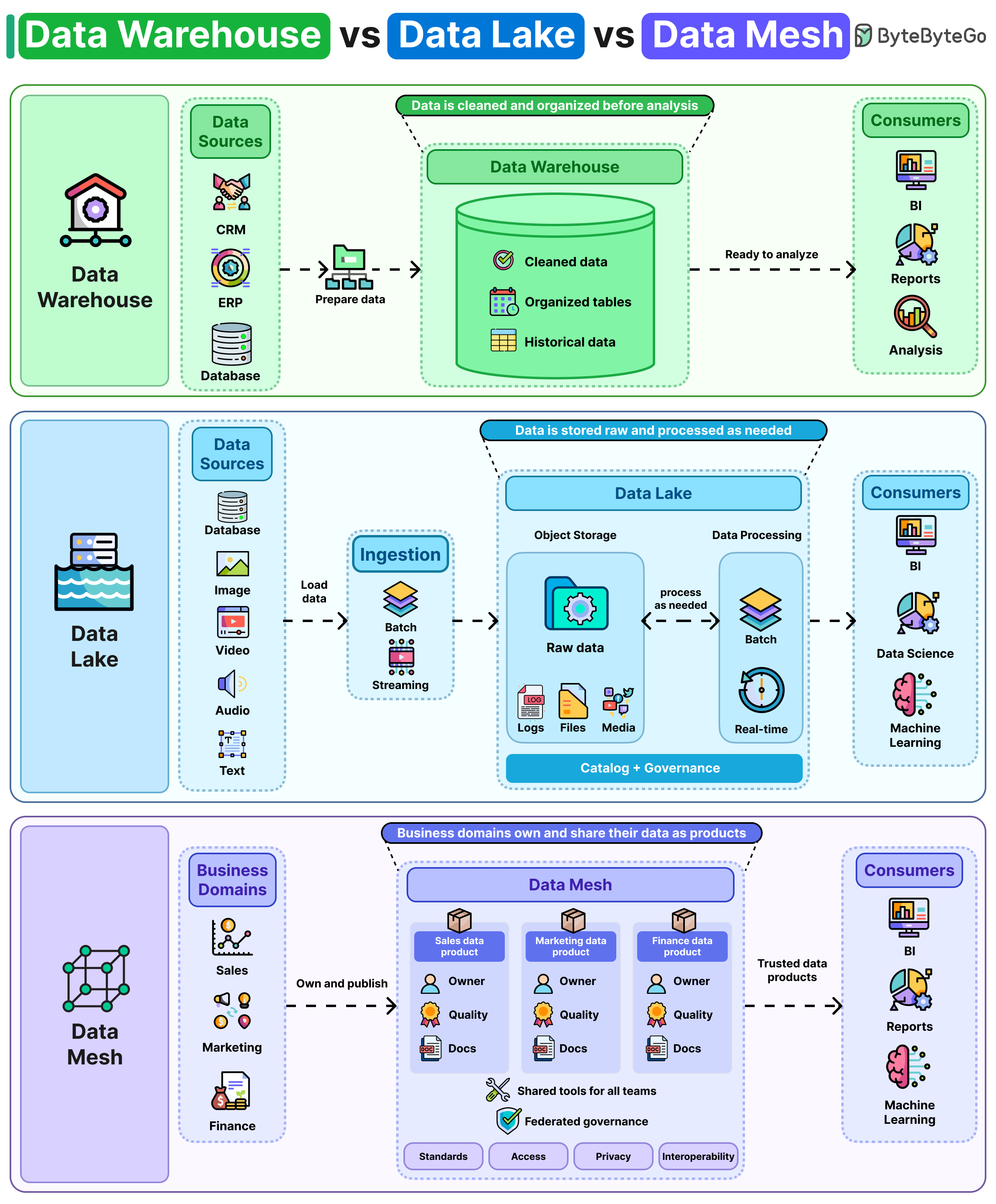 In practice, many companies use more than one approach. They'll use a warehouse for dashboards and reporting, a lake for machine learning workloads and start applying mesh principles as teams scale.
