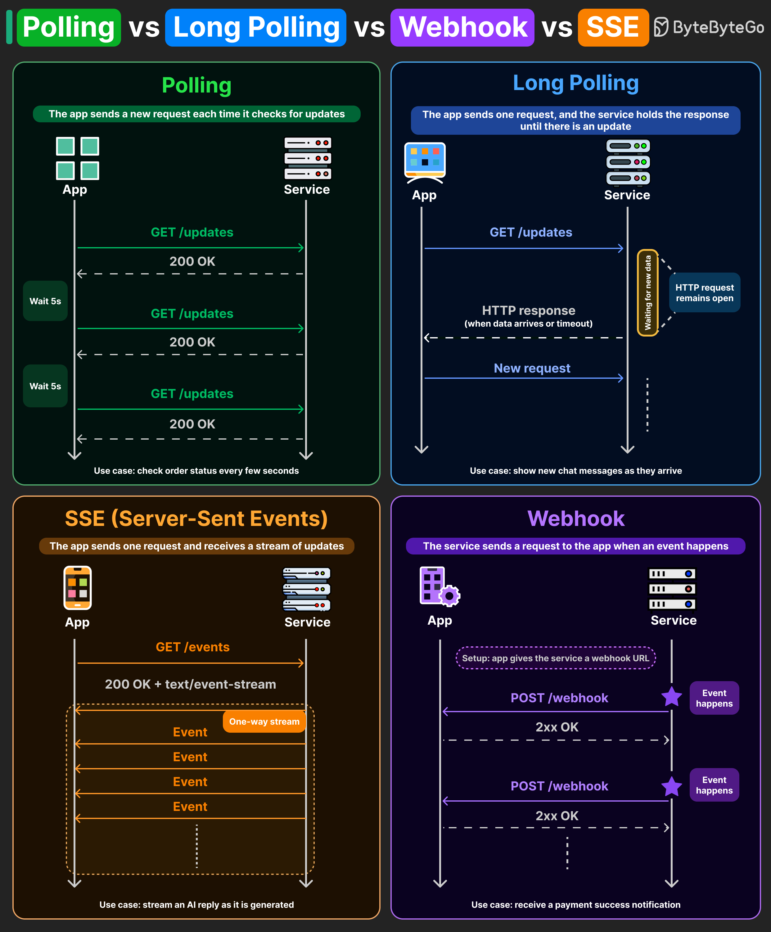 Many systems don't rely on a single pattern. You may use polling for order status, SSE for streaming AI responses, and webhooks for payment confirmations.