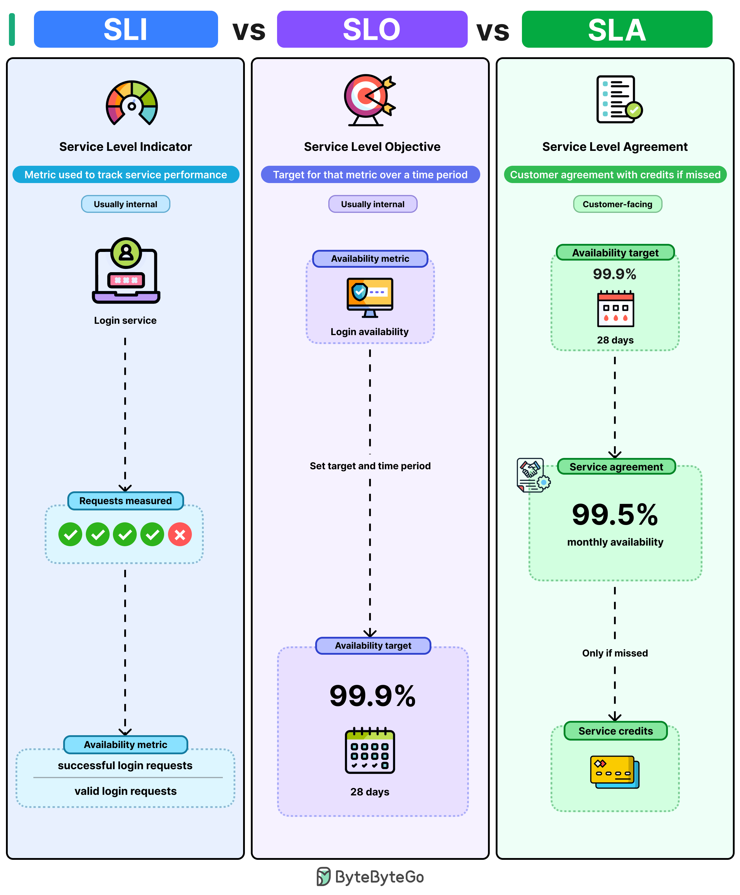 SLA (Service Level Agreement): This is what you promise your customers in a contract. It's usually set lower than the SLO, say 99.5% monthly availability. If you breach it, you owe service credits.