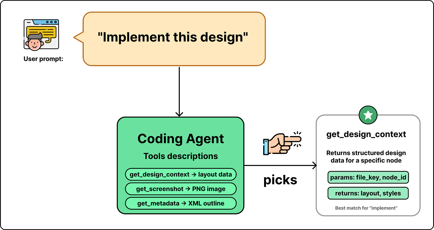 The agent does not know how Figma works internally. It reads these descriptions the same way a developer reads API documentation, then decides which tool to call based on the user’s prompt.