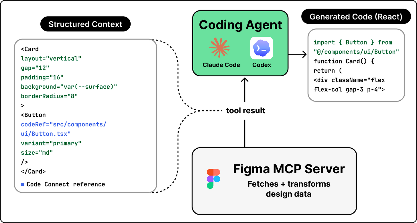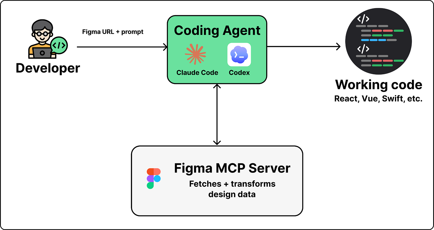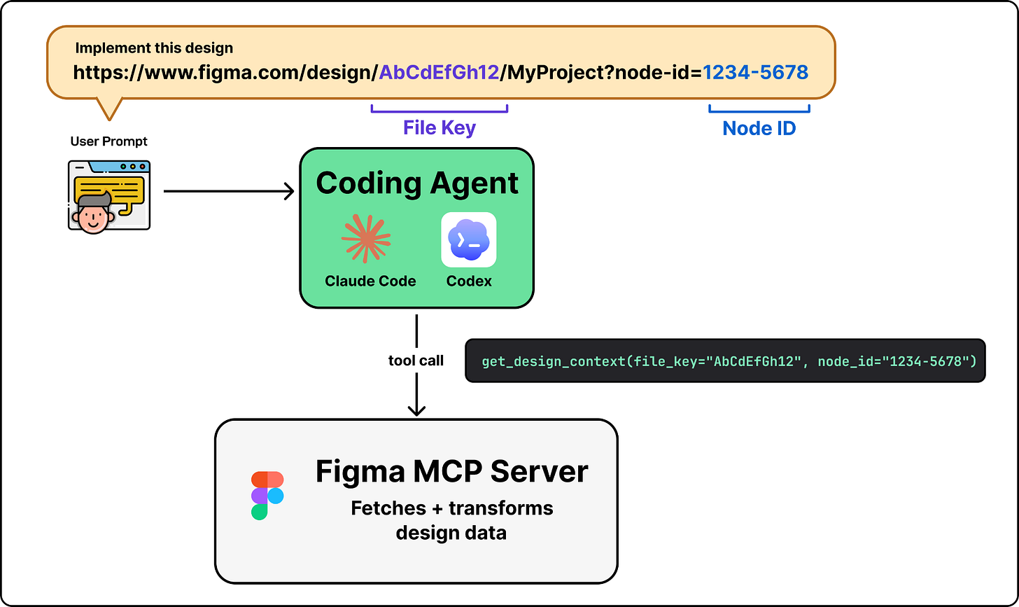 The design-to-code workflow starts when a developer selects a frame in Figma, copies its URL, and pastes it into a coding agent like Claude Code or Codex with a prompt like “Implement this design.” The agent then produces working code that matches the design. Here is what happens behind the scenes.