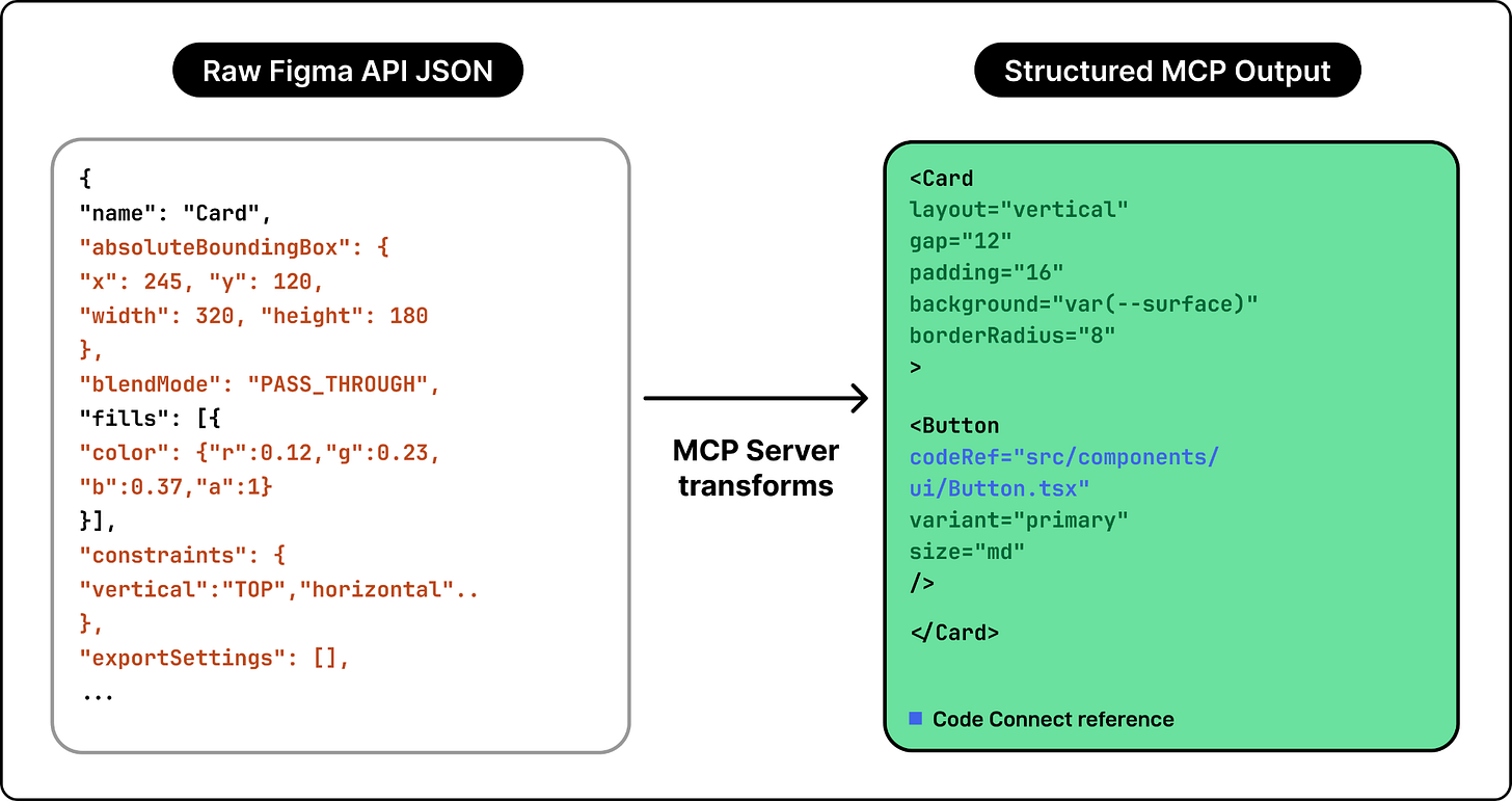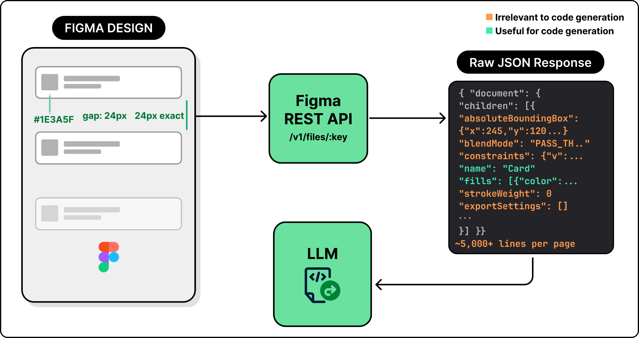 Neither approach works on its own. Screenshots lack precision. Raw API data has precision but drowns the LLM in noise. What you actually need is something in between: structured design data that preserves exact values like colors, spacing, and component names, but strips out the noise that is not needed for code generation.