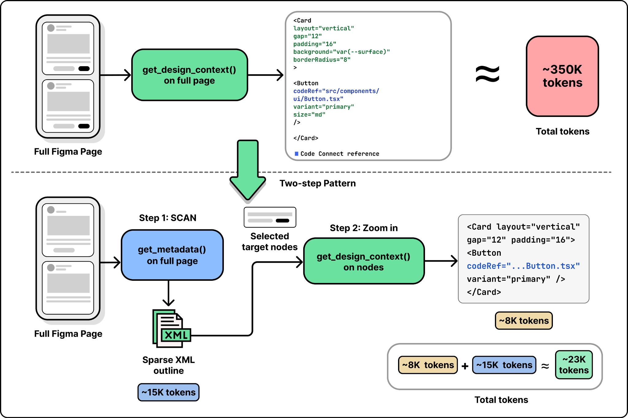 To mitigate this, Figma developed the get_metadata tool. Instead of the full styled representation, it returns a sparse XML outline. A developer can call get_metadata on an entire page to see the structure, identify the specific nodes they need, and then call get_design_context only on those nodes. It is a two-step pattern: scan first, then zoom in.