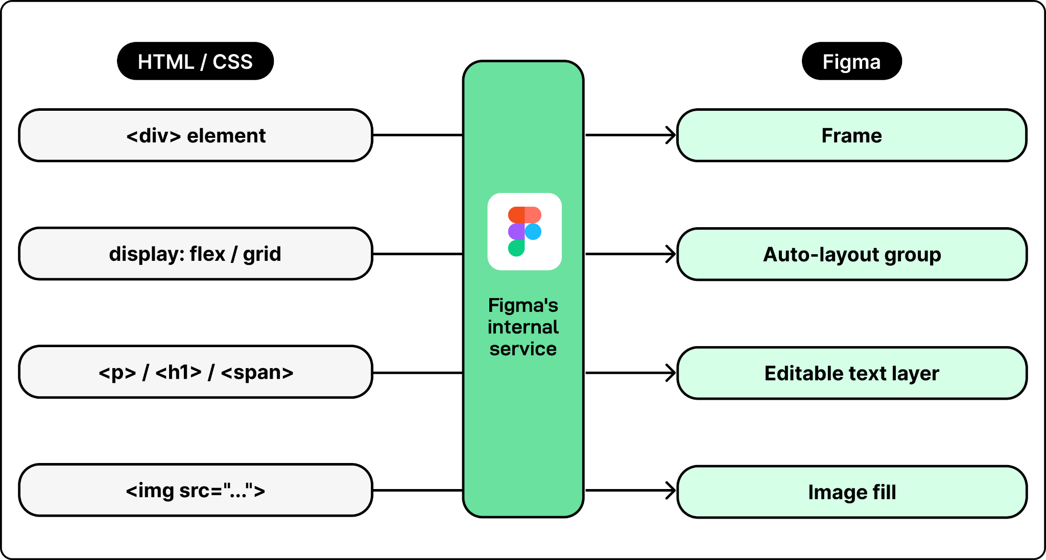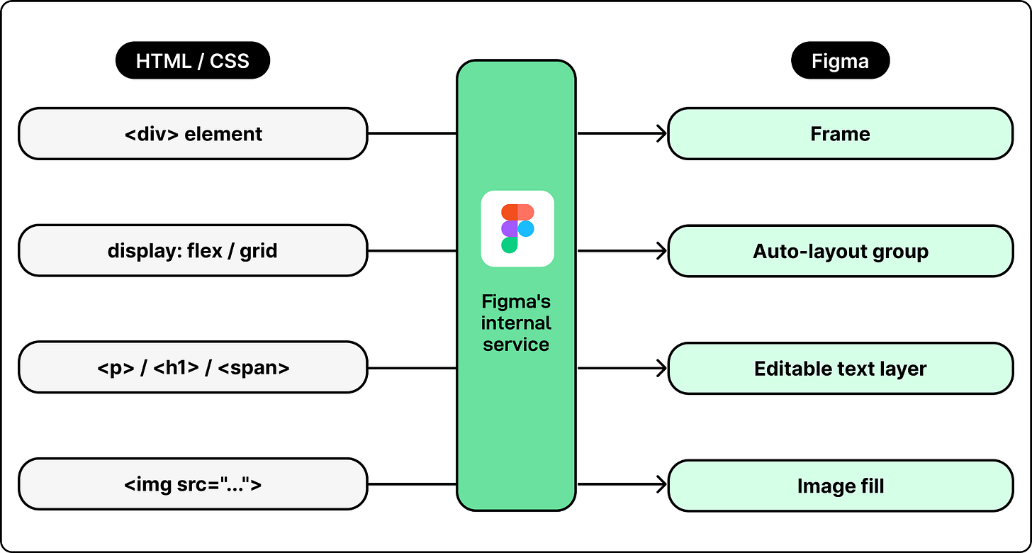 The captured DOM data gets sent to Figma’s backend, where it is reconstructed as native Figma design layers. Each HTML element maps to a Figma frame or shape. CSS flexbox and grid layouts become Figma auto-layout groups. Text nodes become editable Figma text layers with the correct font, size, weight, and color. Images get extracted and embedded as image fills.