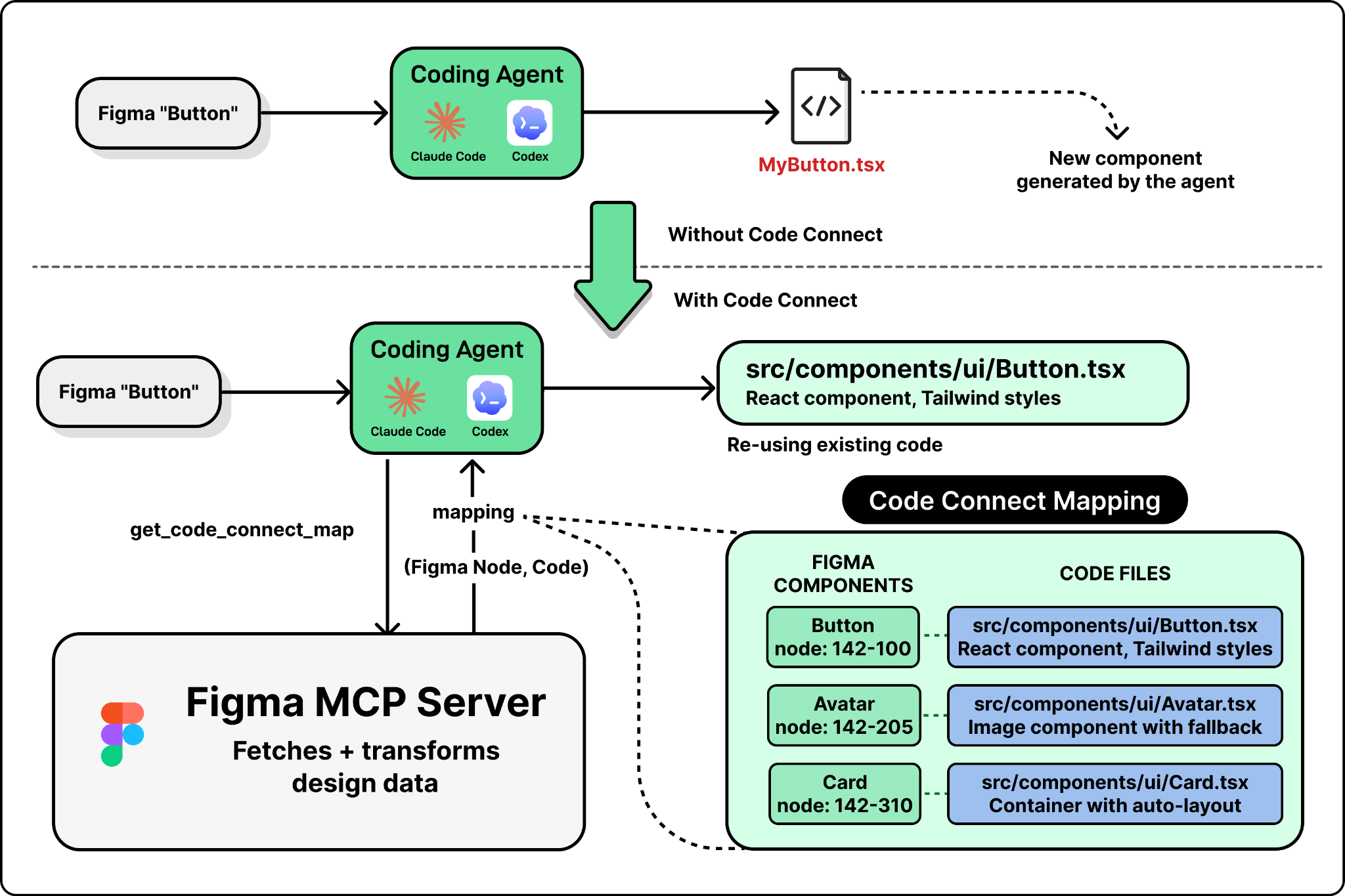 Figma mitigates this with Code Connect, which lets teams create explicit mappings between Figma node IDs and code file paths. Once set up, the MCP server includes these mappings in its response, and the agent reuses the actual component instead of guessing.