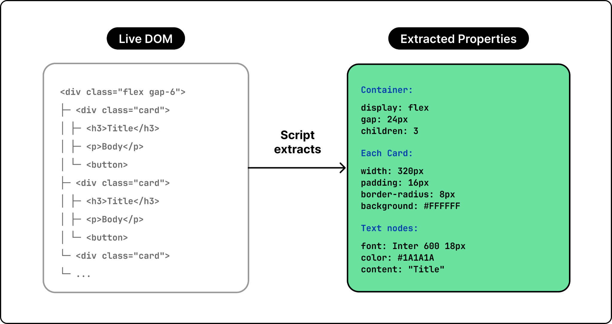 This is what makes the output editable in Figma. A screenshot captures pixels. The DOM walk captures structure and relationships between elements.