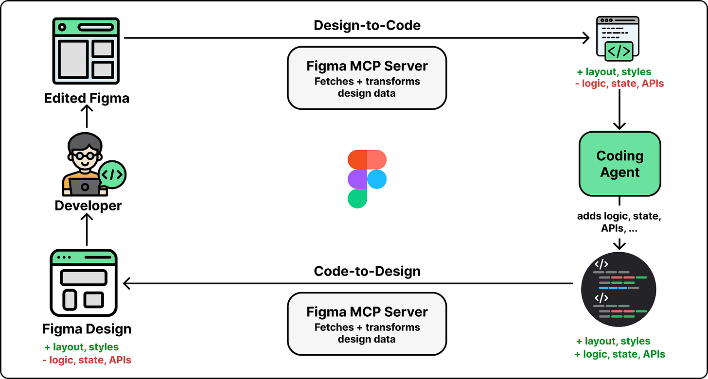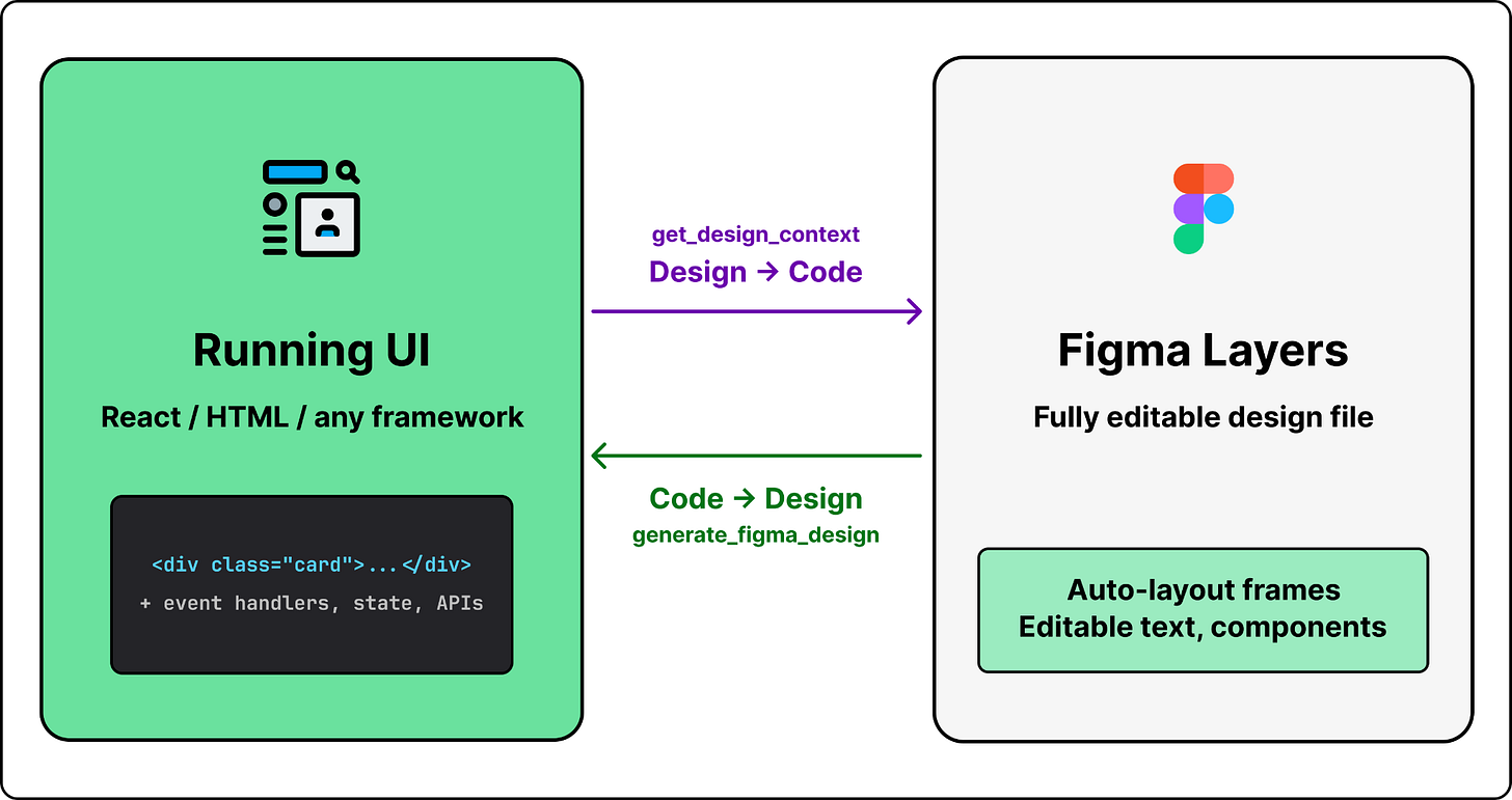 The bidirectional loop sounds seamless, but each handoff loses information. When a design goes from Figma to code, the structured context captures layout, styles, and component references, but not business logic, event handlers, state management, or API calls. The agent fills those in when generating code.