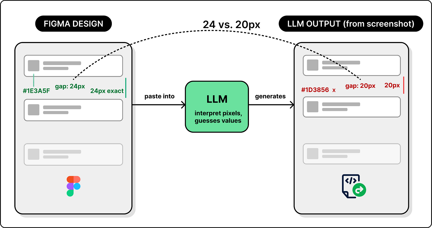 This works for simple UIs. But it breaks down for anything complex. The LLM has to guess values based on pixels. It doesn’t know the exact color or that the spacing between cards is 24px, not 20px. The output may look close, but not identical.