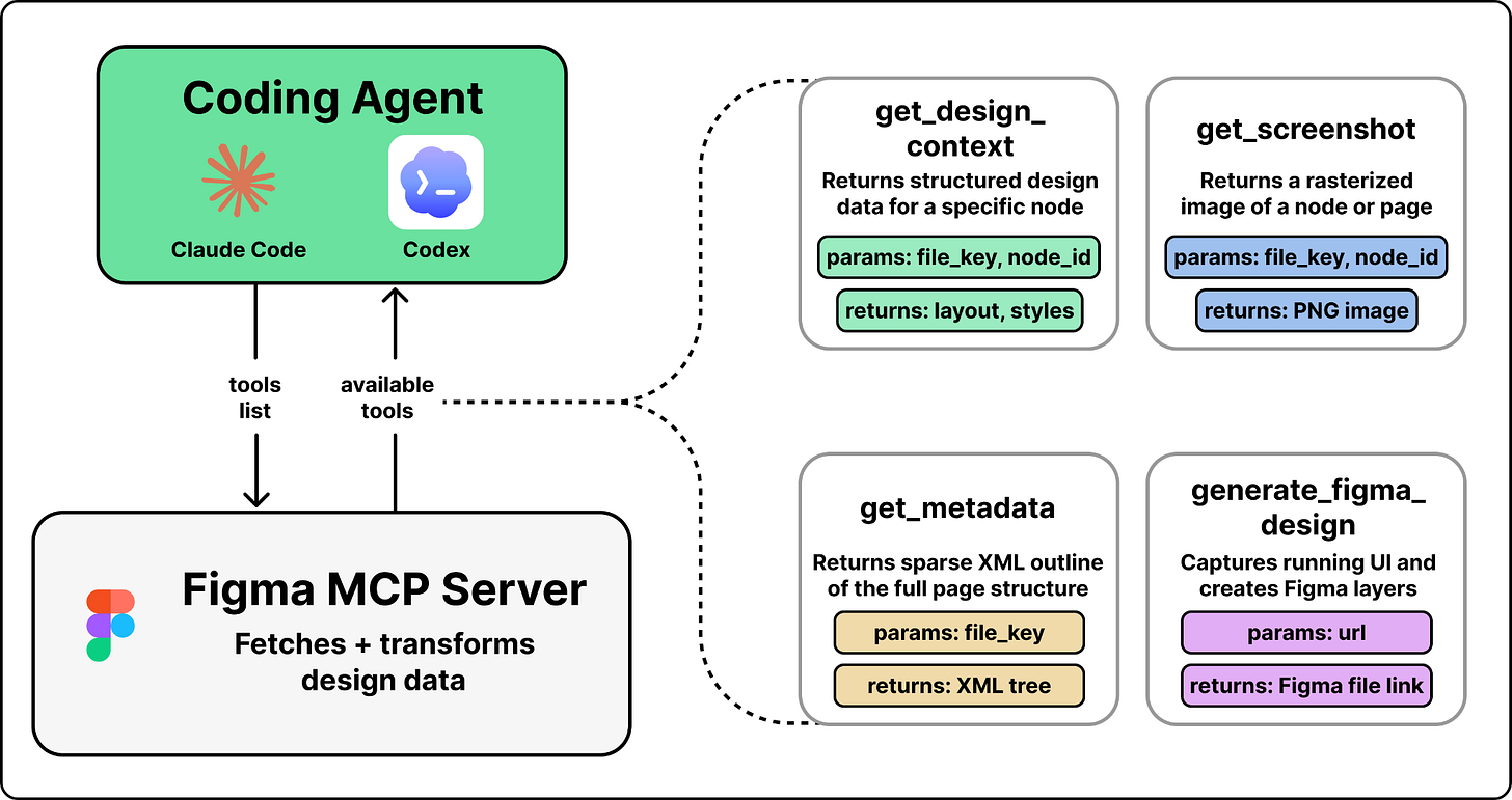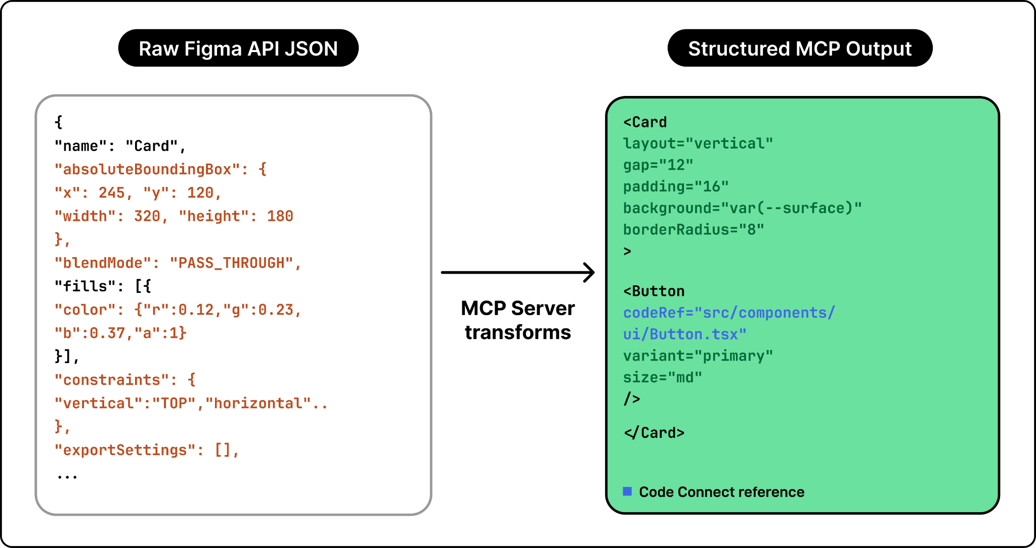 That is what Figma’s MCP server does. MCP stands for Model Context Protocol, a standard that defines how AI agents discover and call external tools. Figma’s MCP server takes the raw design data from Figma’s REST API, filters out the noise, and transforms what remains into a clean, structured representation. Pixel positions become layout relationships like “centered inside its parent.” Raw hex colors become design token references. Deeply nested layers get flattened to match what a developer would actually build. The result is a compact, token-efficient context that an LLM can act on directly.