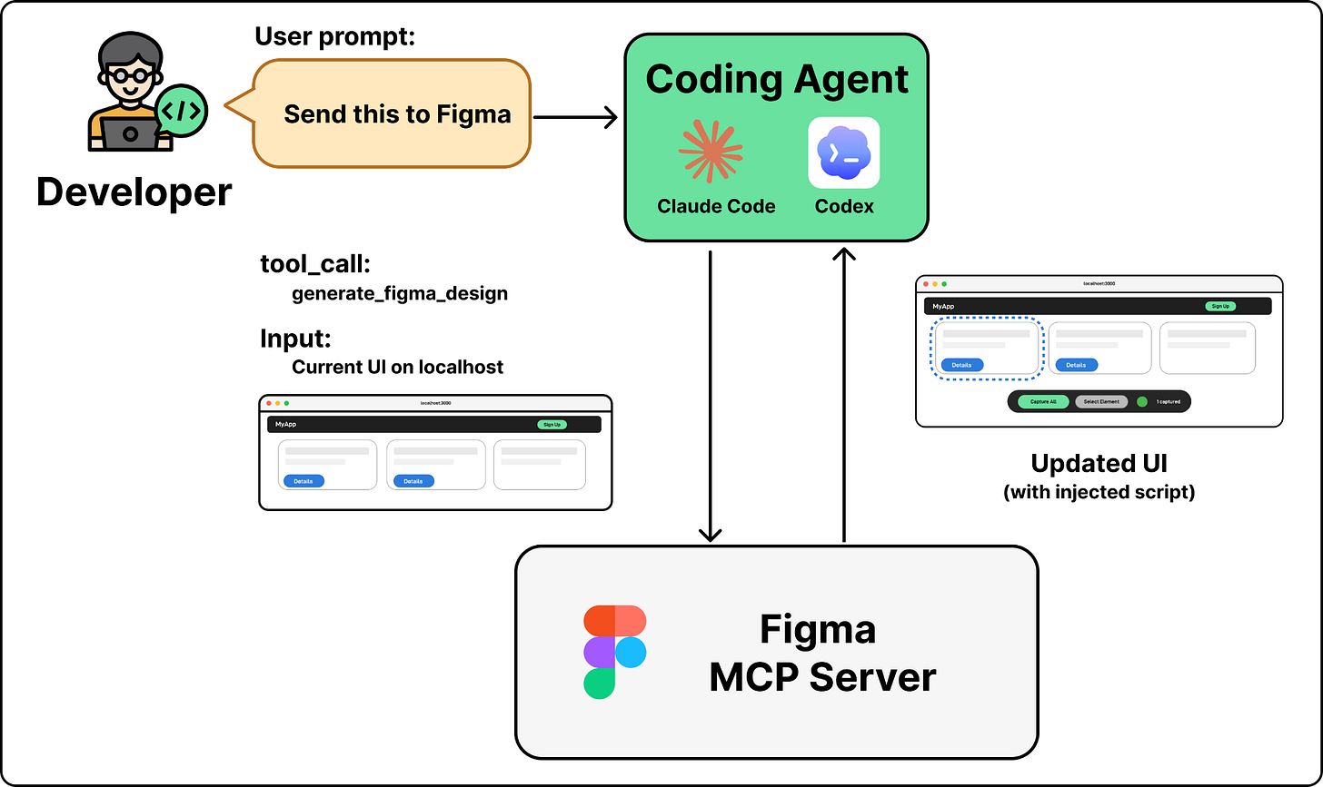 When the developer prompts “send this to Figma,” the agent calls MCP server’s generate_figma_design tool.