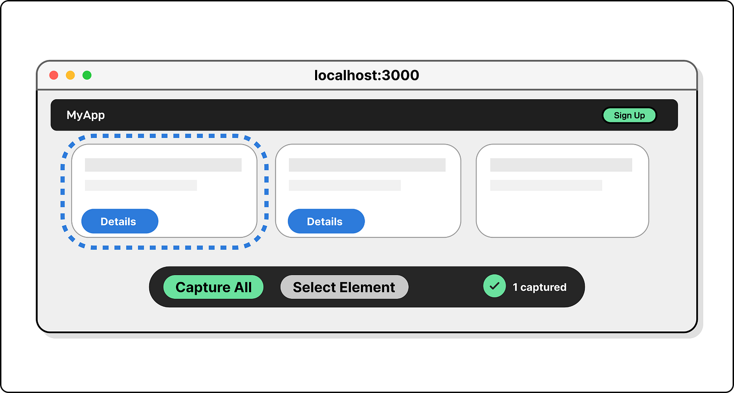 When the browser window opens, two things appear: the running UI and a capture toolbar overlay. An initial capture happens automatically when the page loads. From there, the developer can capture the entire screen or select specific elements.