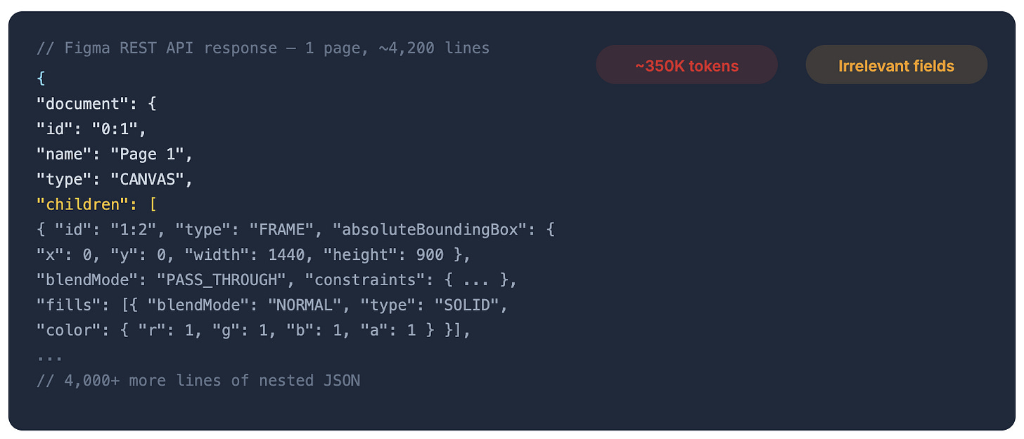 But having all the data introduces its own problem: there is far too much of it. A single Figma page can produce thousands of lines of JSON, filled with pixel coordinates, visual effects, internal layout rules, and other metadata that are not useful for code generation. Dumping all of this into a prompt can exceed the context window. Even when it fits, the LLM has to wade through pixel coordinates, blend modes, export settings, and other visual metadata that have nothing to do with building a UI, which degrades the output quality.