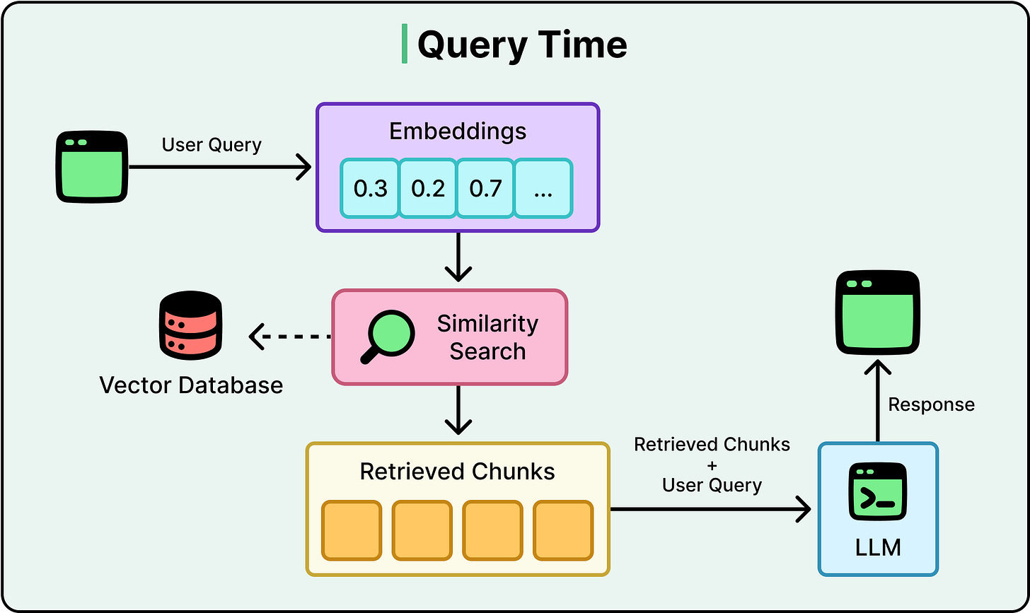 It then searches a vector database, a database optimized for finding content with similar meaning, and retrieves the top matching chunks of text.