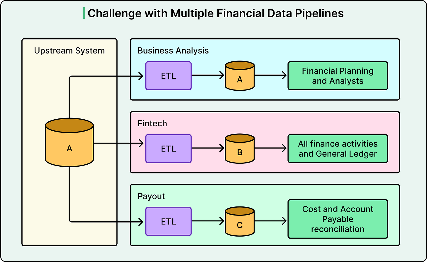 Second, inconsistent definitions and transformations created confusion across the organization. Each team applied its own logic and assumptions to the same data sources. As a result, financial metrics could differ depending on which pipeline produced them. For instance, the Finance team might calculate revenue differently from the Analytics team, leading to conflicting reports when executives ask fundamental questions about business performance. This undermined data reliability and created a lack of trust in the numbers.
