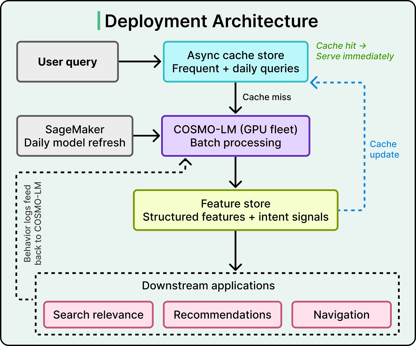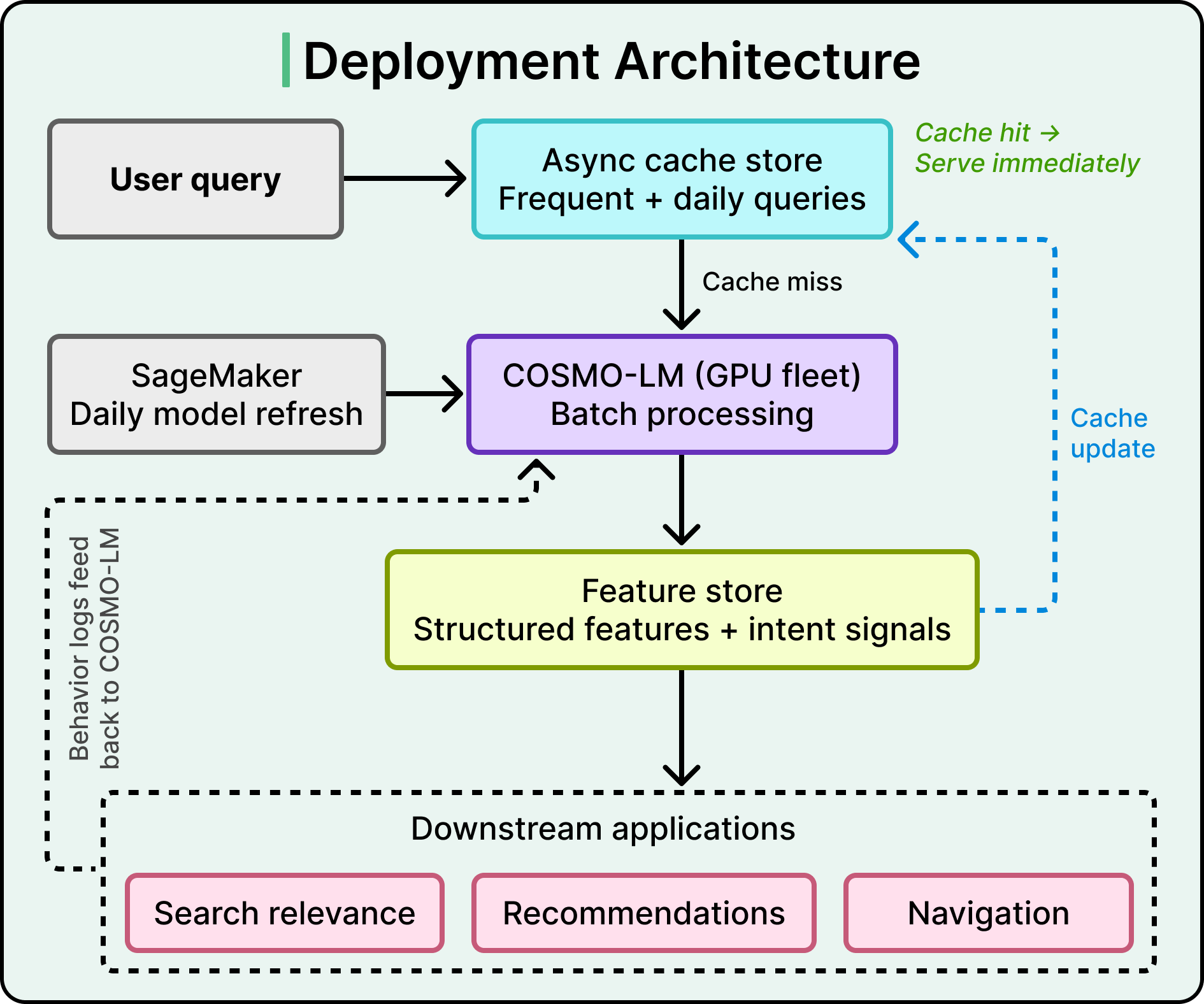 This architecture meets Amazon’s strict search latency requirements while keeping storage costs comparable to real-time serving for most traffic. But it comes with a tradeoff. COSMO updates daily, which means it cannot incorporate real-time events like flash sales that fluctuate within hours. Amazon explicitly acknowledges this limitation and identifies it as an area for future development.