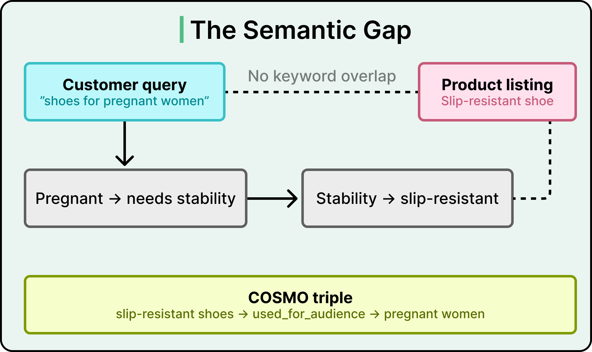 For example, a query like “winter clothes” carries an implicit intent around warmth. The product catalog for a long-sleeve puffer coat describes its material, size options, and sleeve length, but it may say nothing about warmth directly. The gap between what the customer typed and what the product listing says requires a reasoning step that factual knowledge graphs were never designed to handle.