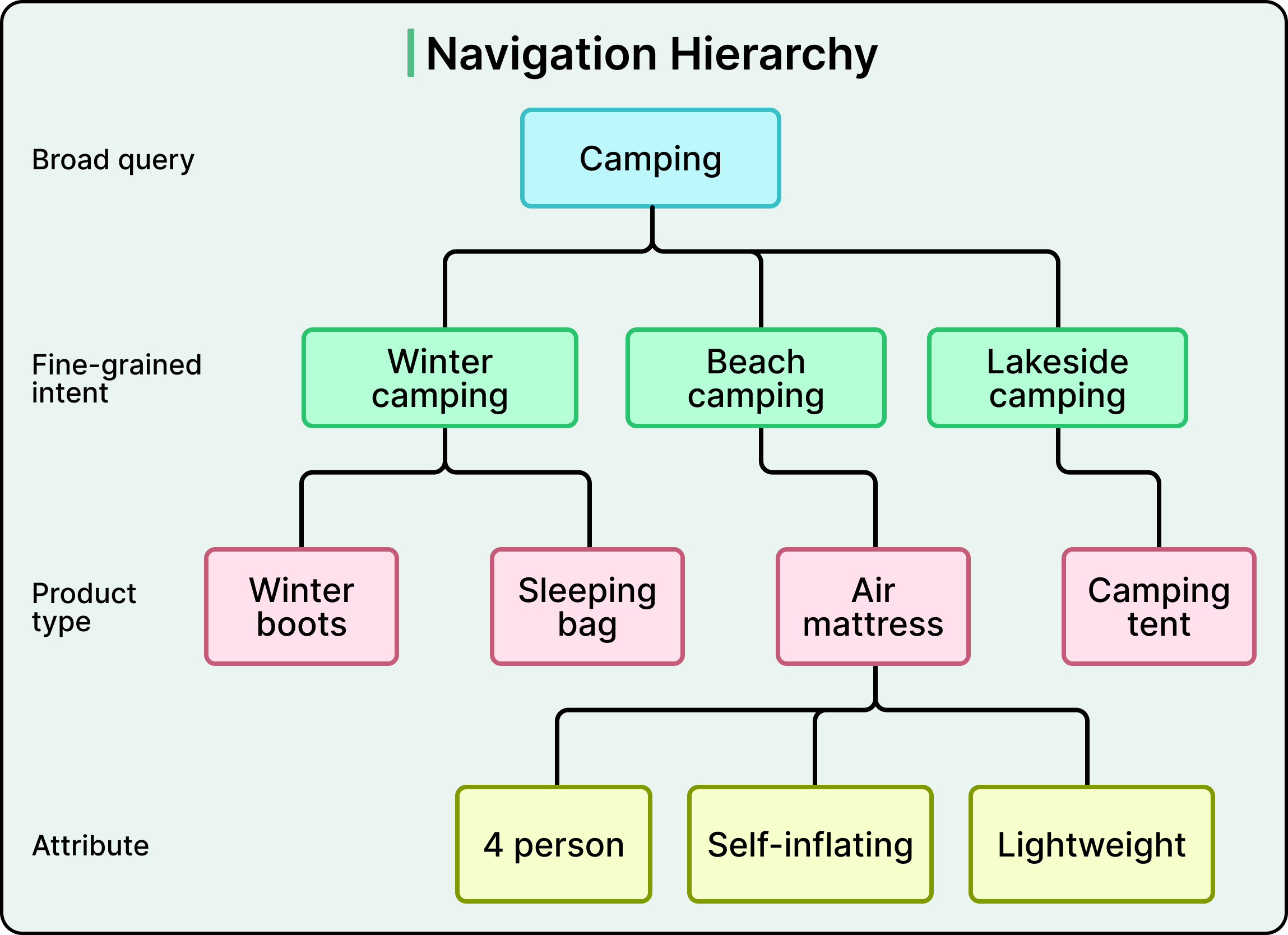 Search navigation is where COSMO reached production and generated real business impact. COSMO powers a multi-turn navigation system that organizes intent hierarchically. A search for “camping” branches into fine-grained intents like “winter camping,” “beach camping,” or “lakeside camping.” These connect to product types like “air mattress” or “winter boots,” which are then further refined by attributes like “4 person.”