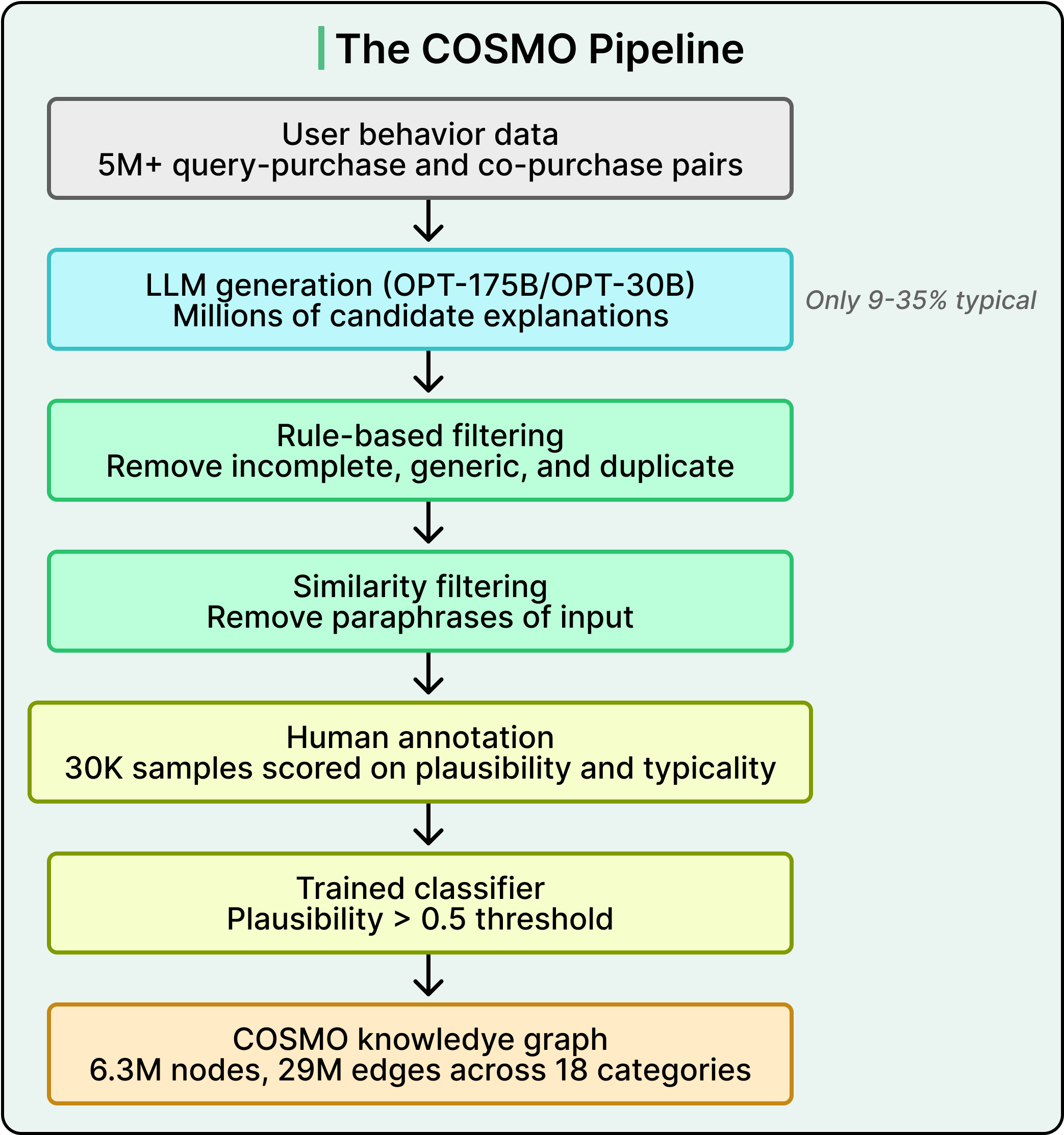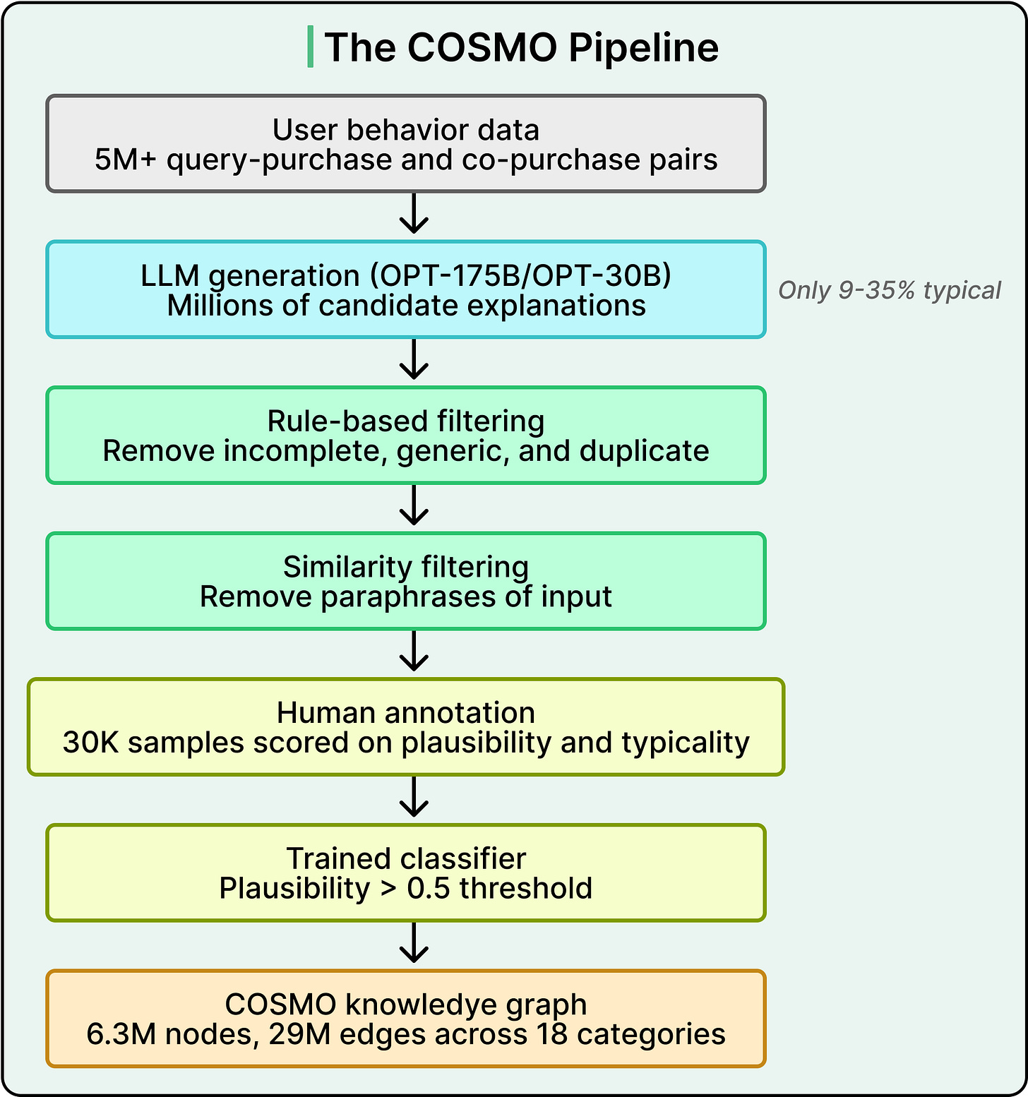 The gap was clear. Though factual product knowledge and general commonsense knowledge existed, structured knowledge about why people buy things at an e-commerce scale was missing.