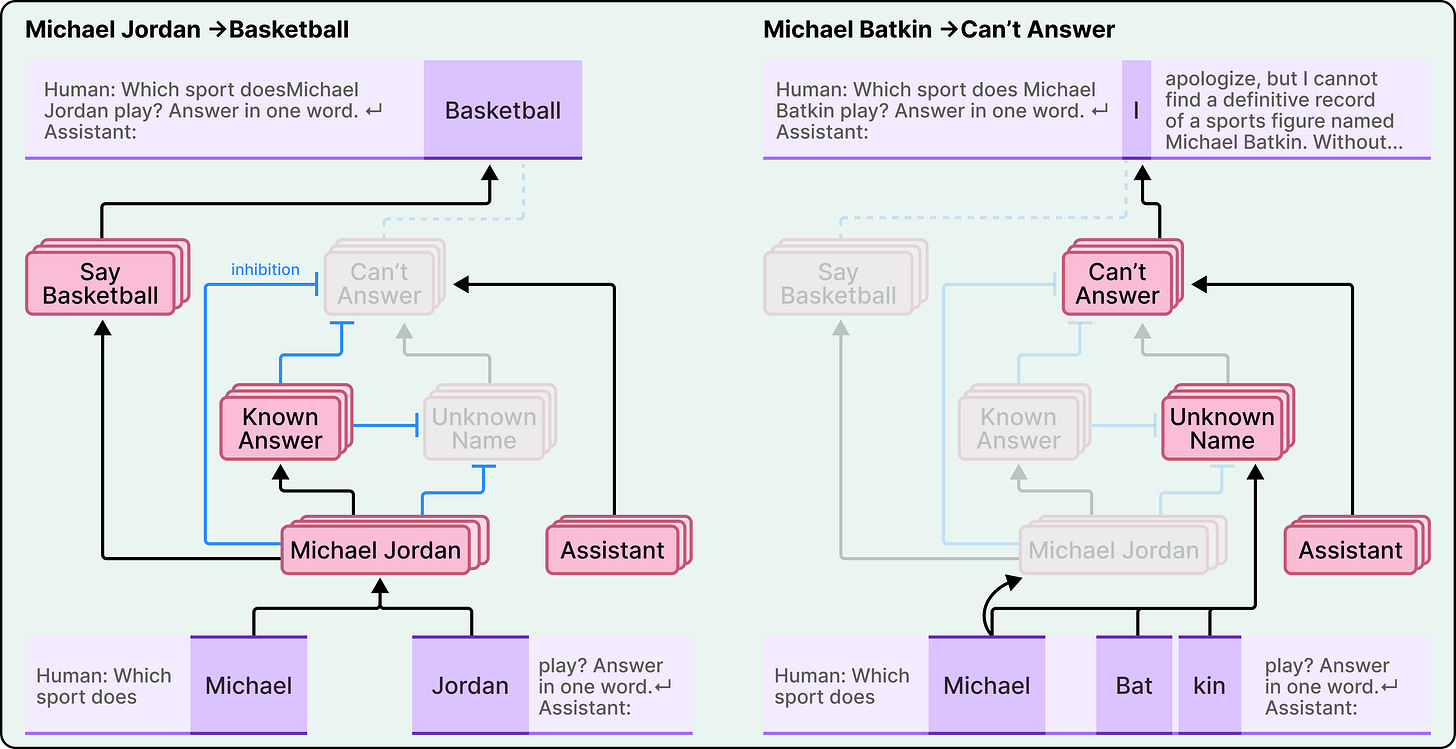 What lets Claude answer questions at all is a separate mechanism. When the model recognizes a well-known entity, say the basketball player Michael Jordan, a “known answer” feature activates and inhibits the default refusal circuit. This inhibition is what allows Claude to provide an answer.