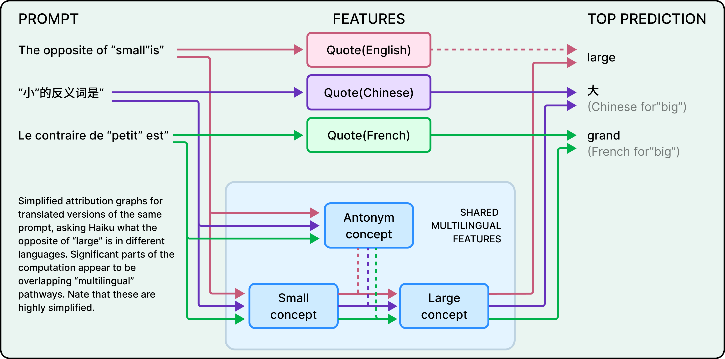 There isn’t. When the researchers asked Claude for “the opposite of small” in English or French, they found that the same core features for “smallness” and “oppositeness” were activated regardless of the language used in the prompt. These shared features triggered a concept of “largeness,” which then got translated into whatever language the question was asked in.