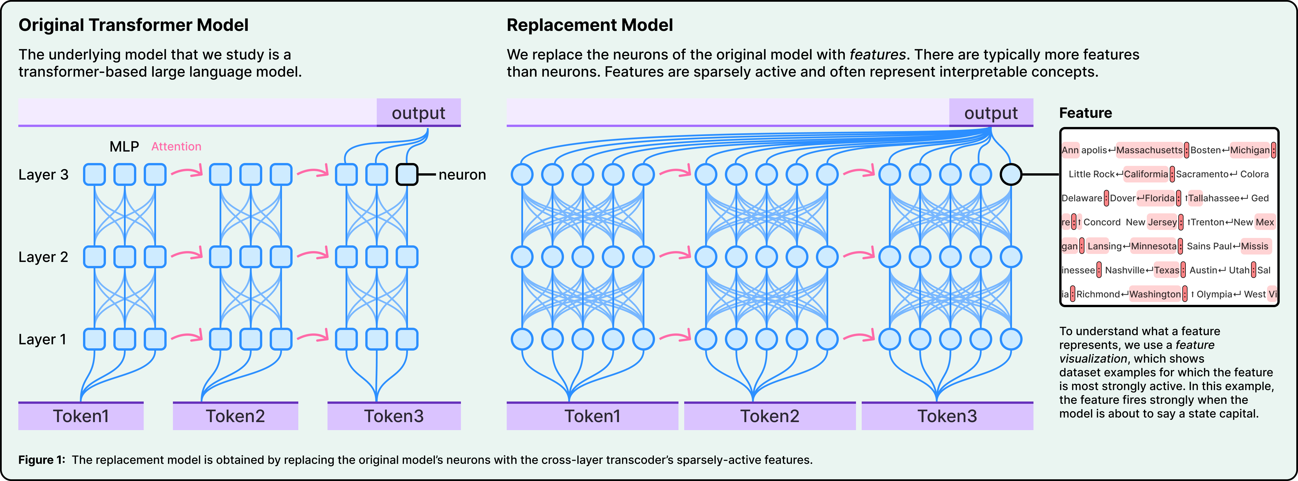 To find these features, the team built a replacement model, which is basically a simplified copy of Claude that swaps neurons for features while producing the same outputs. They study this copy, not Claude directly.
