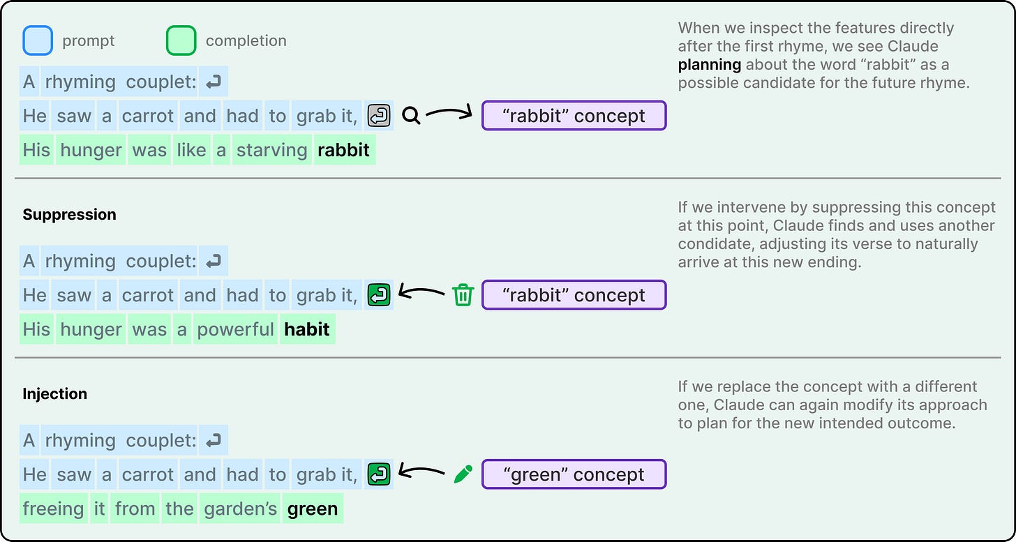 The intervention experiments confirmed this was real. When the researchers suppressed the “rabbit” feature in Claude’s internal state, the model rewrote the line to end with “habit” instead. When they injected the concept of “green,” it wrote a completely different, non-rhyming line ending in “green.” This demonstrates both planning ability and flexibility.