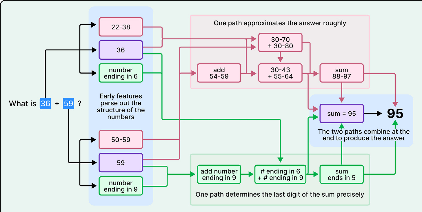 Take a simple example. Ask Claude to add 36 and 59, and it will probably tell you it carried the ones and added the columns as per the standard algorithm we all learned in school. However, when the researchers watched what actually happened inside Claude during that calculation, they saw something quite different. There was no carrying. Instead, two parallel strategies ran at once, one estimating the rough answer and another precisely calculating the last digit. In other words, Claude got the math right, but had no idea how it was done.