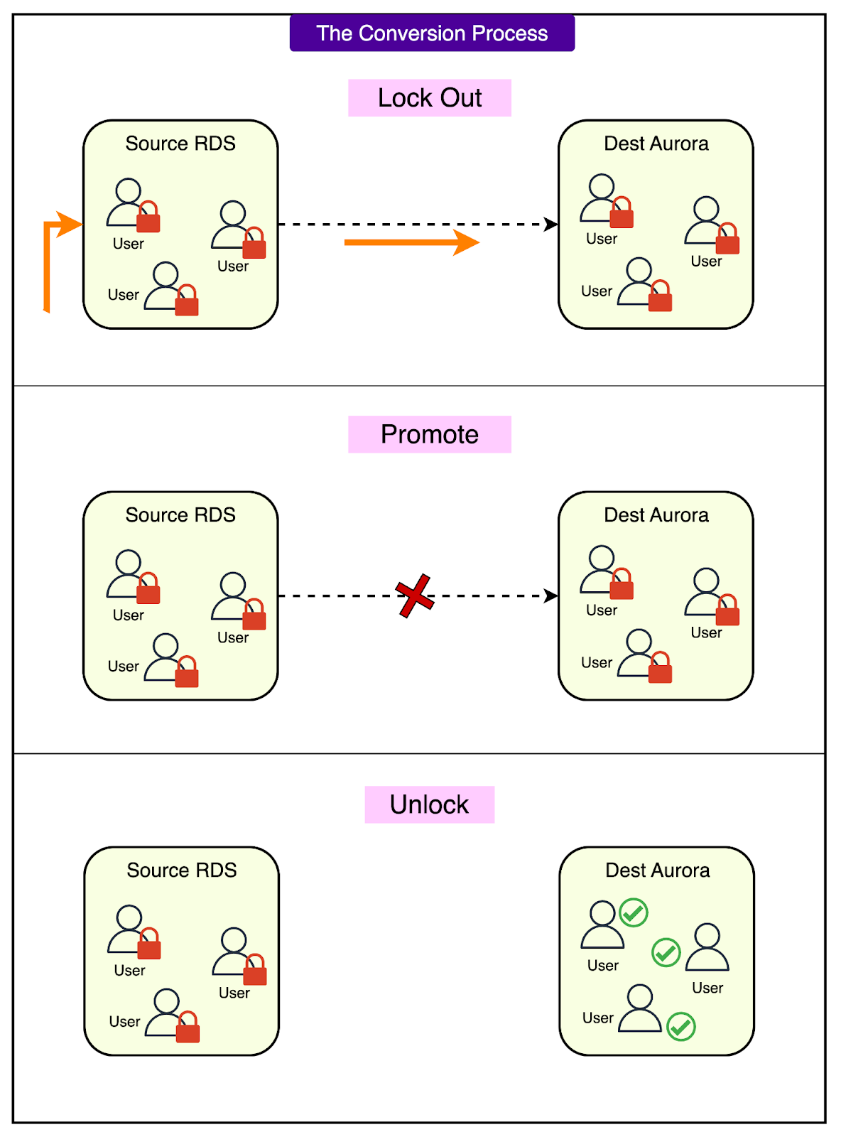 Atlassian's team chose what seemed like a textbook approach for migrating from RDS to Aurora. This process is also known as “conversion”.