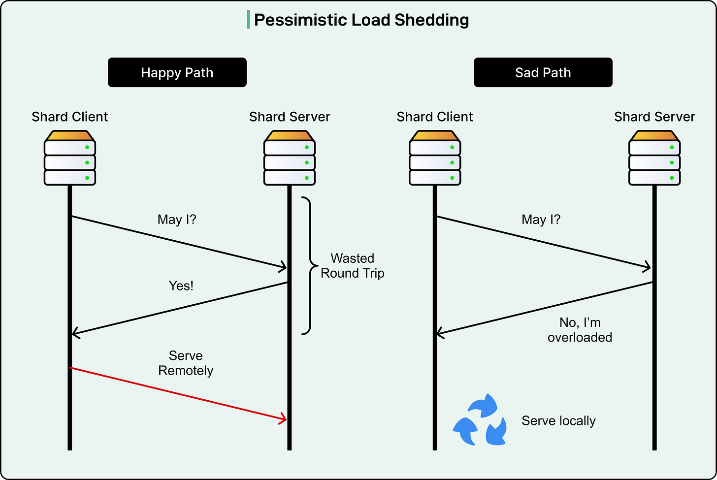 The second approach sends the request optimistically without waiting for permission. If the shard server becomes overloaded, it forwards the request back to the shard client. This avoids the round-trip latency penalty when the shard server can handle the request, which is the common case.