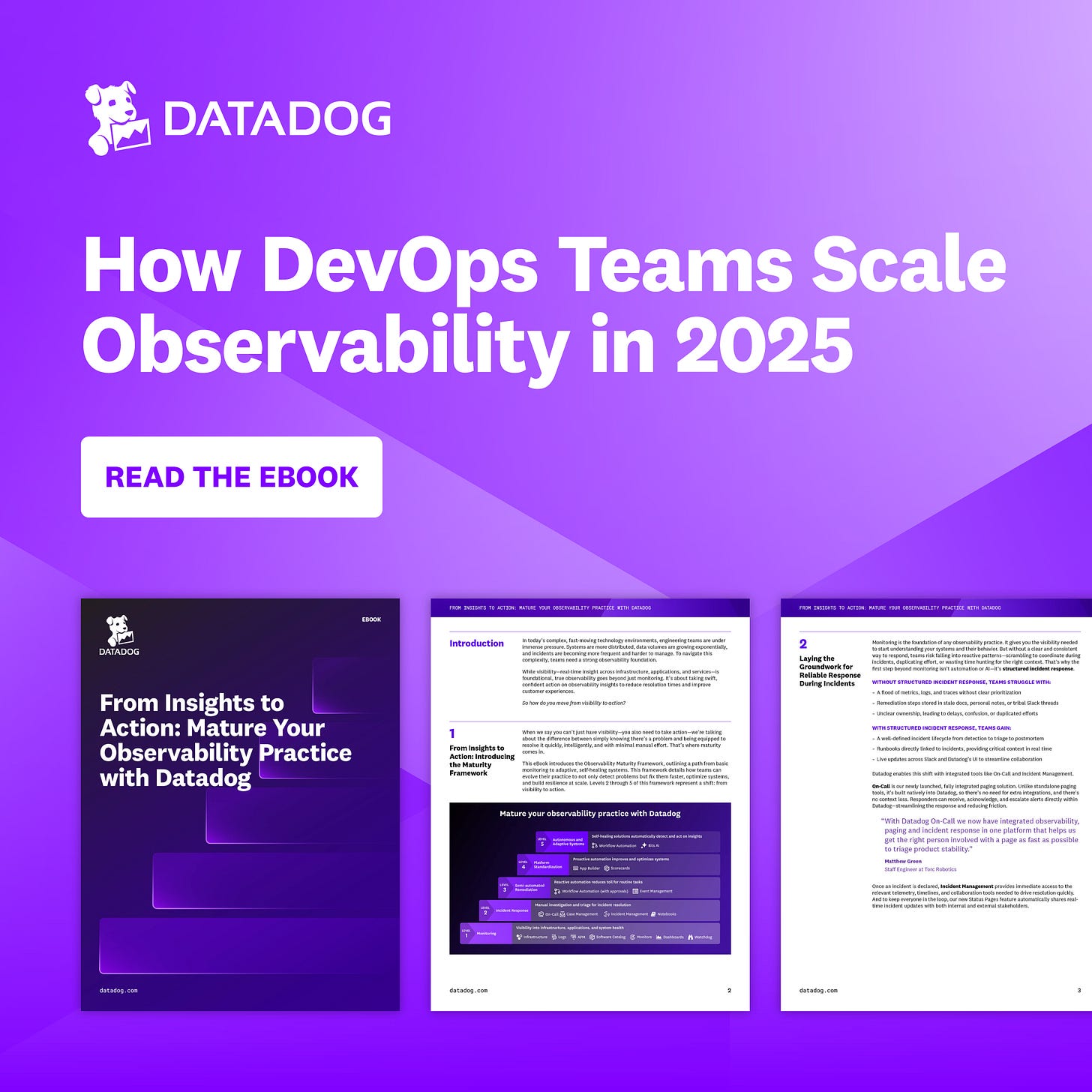 Today’s systems are getting more complex, more distributed, and harder to manage. If you’re scaling fast, your observability strategy needs to keep up. This eBook introduces Datadog’s Observability Maturity Framework to help you reduce incident response time, automate repetitive tasks, and build resilience at scale.