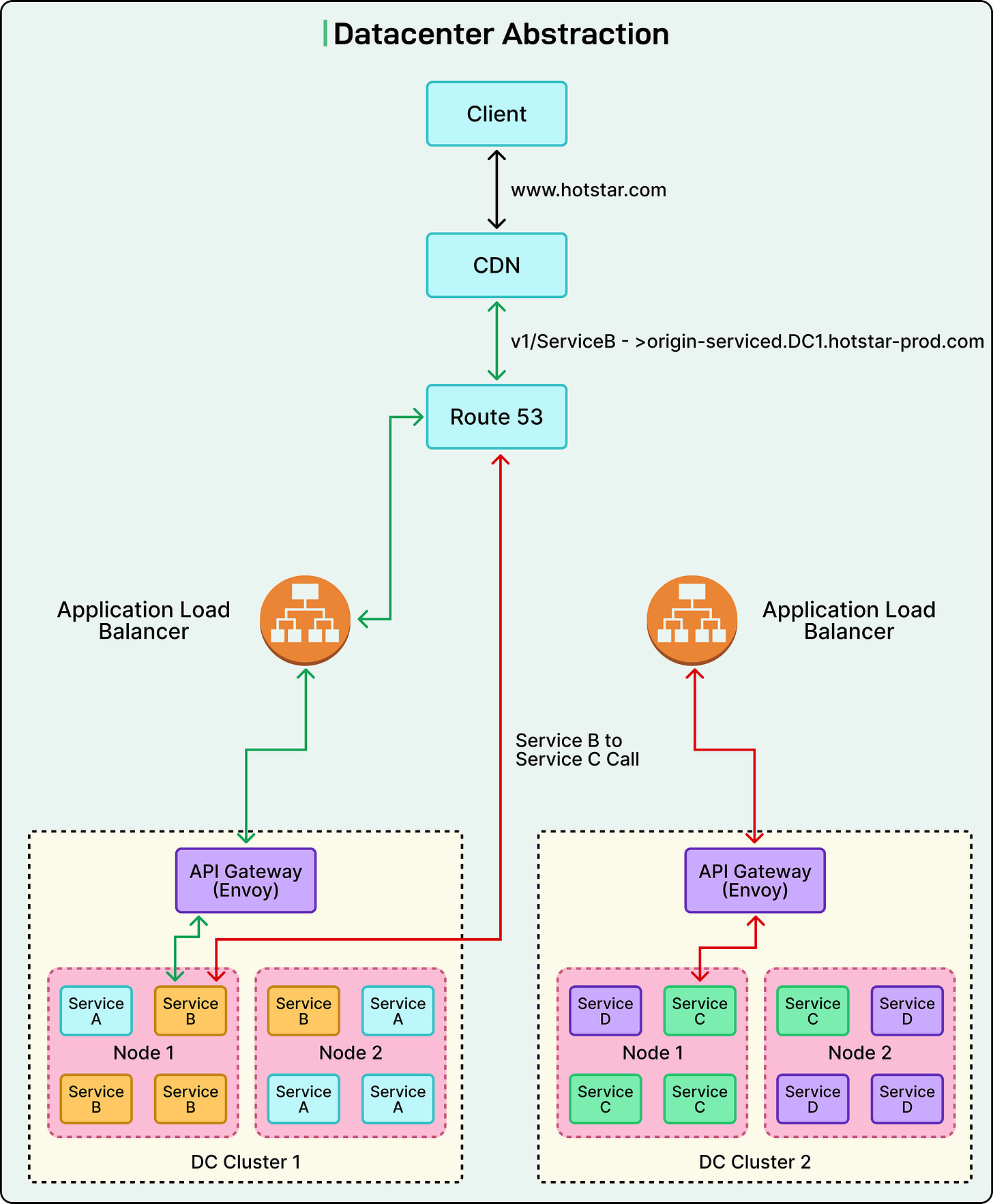 To overcome the limitations of the old setup, Disney+ Hotstar introduced a new architectural model known as Datacenter Abstraction. In this model, a “data center” does not refer to a physical building but a logical grouping of multiple Kubernetes clusters within a specific region. Together, these clusters behave like a single large compute unit for deployment and operations.