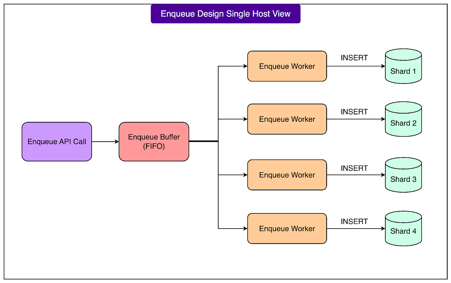 When a client wants to add a new task, it sends an Enqueue request to the appropriate FOQS host. Instead of immediately writing this item to the database, the host first places the request into an in-memory buffer. This approach allows FOQS to batch multiple enqueues together for each shard, which is much more efficient than inserting them one by one. As soon as the request is accepted into the buffer, the client receives a promise that the enqueue operation will be processed shortly.