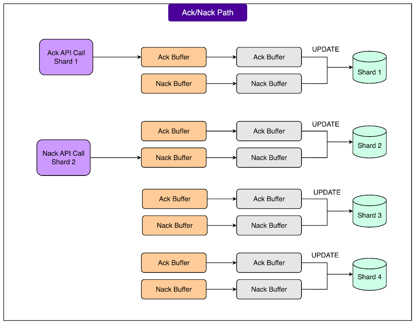 When the FOQS host receives an ack or nack request, it does not immediately write to the database. Instead, it appends the request to an in-memory buffer that is maintained per shard. This buffering is similar to what happens during the enqueue path. By batching multiple ack and nack operations together, FOQS can apply them to the database more efficiently, reducing write overhead and improving overall throughput. See the diagram below: