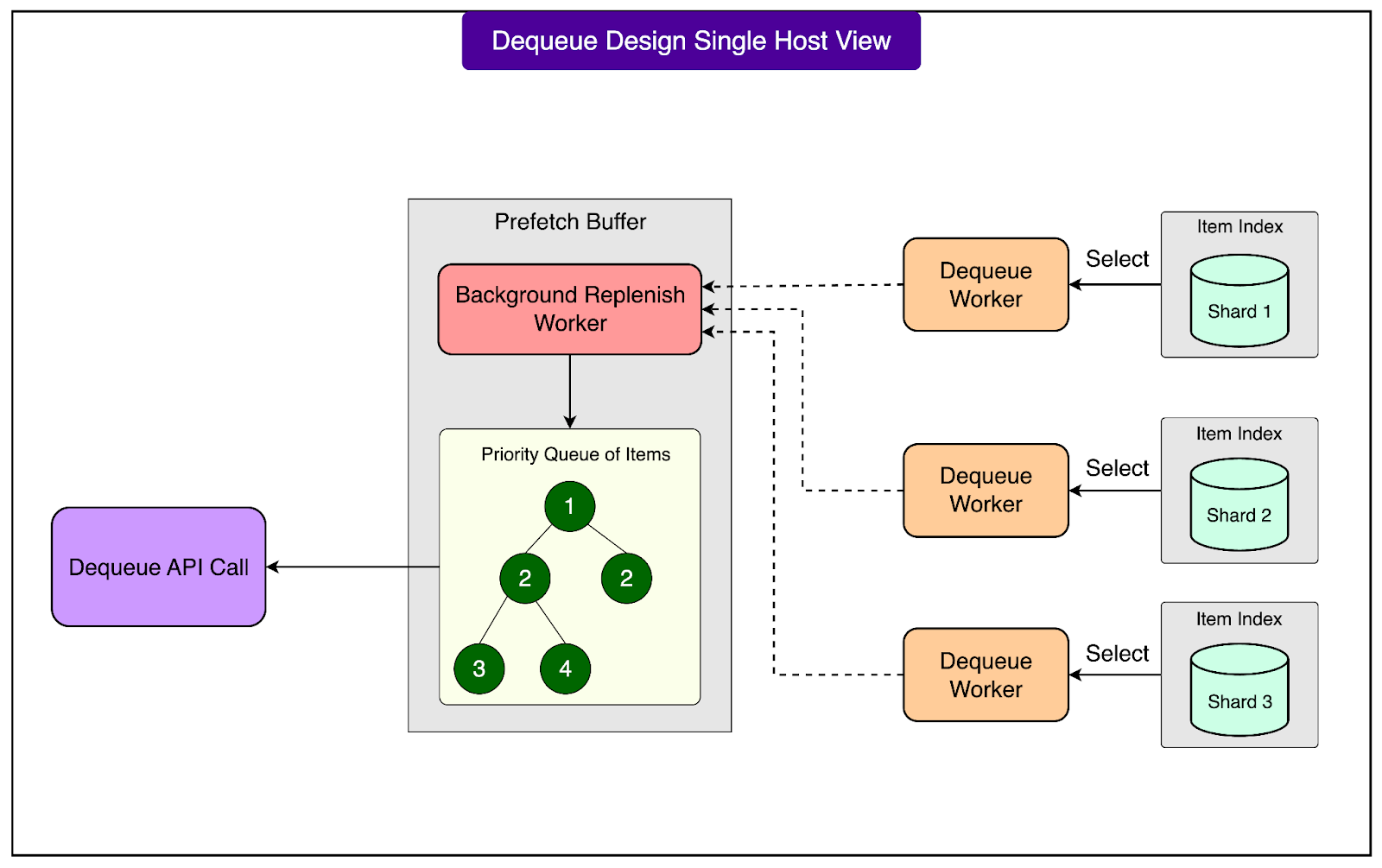 When a client issues a Dequeue request, FOQS simply drains items from the Prefetch Buffer instead of going to the database. This makes dequeue operations very fast, since they are served entirely from memory and benefit from the pre-sorted order of the buffer. The Prefetch Buffer is constantly replenished in the background, so there is usually a pool of ready-to-deliver items available at any moment.