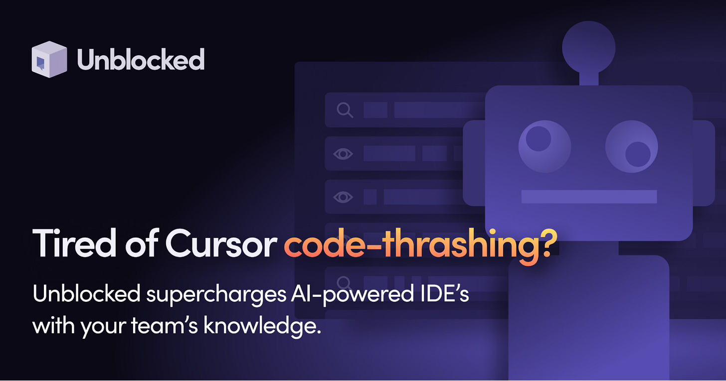 With Unblocked’s MCP server, tools like Cursor and Claude now leverage your team’s historical knowledge across tools like GitHub, Slack, Confluence, and Jira, so the code they generate actually makes sense in your system.