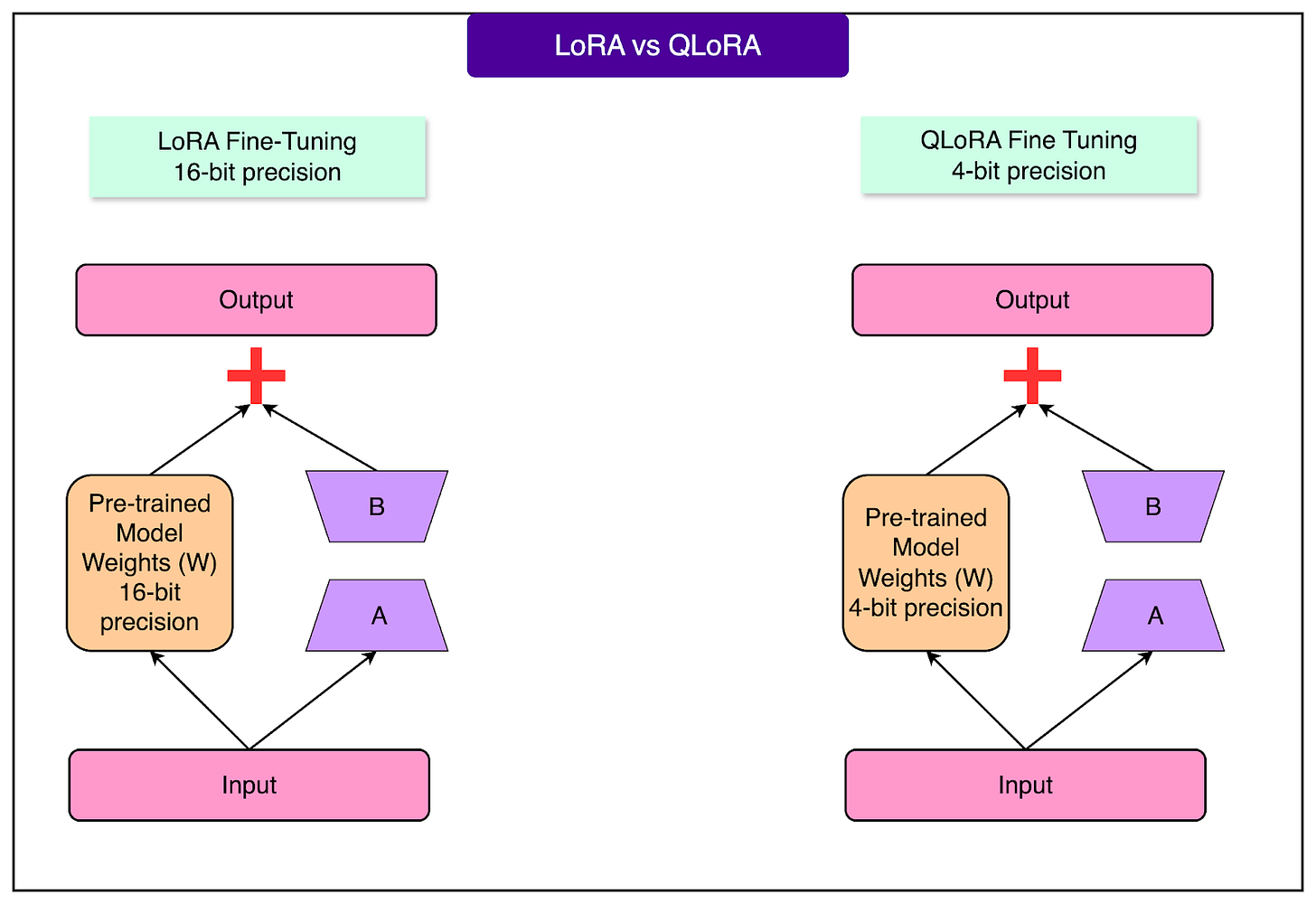 QLoRA keeps the main model compressed to 4-bit precision while maintaining the LoRA adapters at full precision. The model temporarily decompresses relevant sections when needed, adds the high-precision LoRA adjustments, and produces output. This is like having a ZIP file of that massive library, unzipping just the book you need, adding your sticky notes, and then compressing it back.