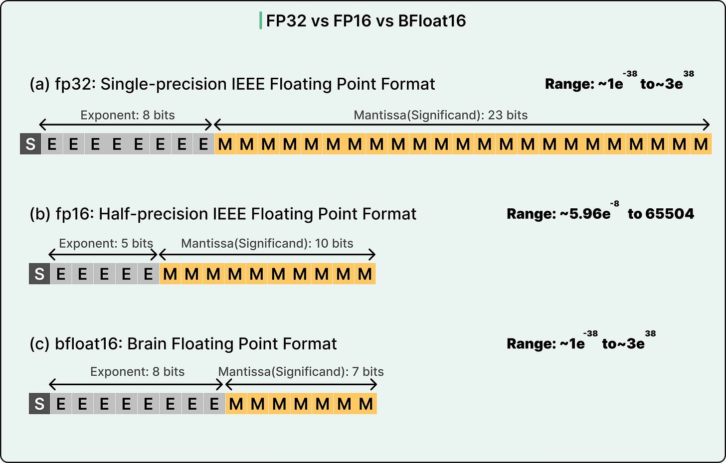 Training requires more precision because small gradient updates accumulate over millions of iterations. Google addressed this by inventing BFloat16, or Brain Floating-Point 16. This format maintains the same 8-bit exponent as a 32-bit float but uses only 7 bits for the mantissa. The key insight was that neural networks are far more sensitive to dynamic range, controlled by the exponent, than to precision, controlled by the mantissa. BFloat16 provides a wide range of floating-point formats with half the bits, enabling efficient training without the overflow problems that plagued alternative 16-bit formats.