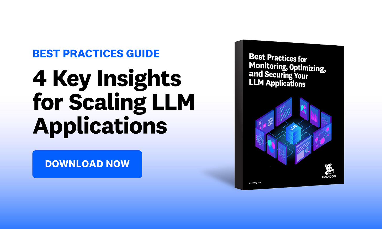 LLM workflows can be complex, opaque, and difficult to secure. Get the latest ebook from Datadog for practical strategies to monitor, troubleshoot, and protect your LLM applications in production. You’ll get key insights into how to overcome the challenges of deploying LLMs securely and at scale, from debugging multi-step workflows to detecting prompt injection attacks.