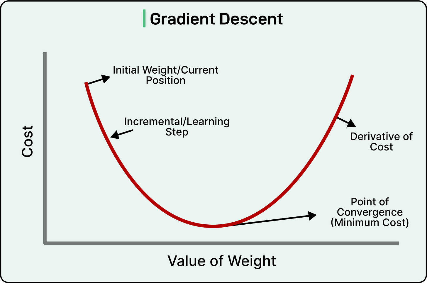 Gradient descent works similarly in an abstract mathematical space. The “landscape” represents how wrong the model’s predictions are across all possible parameter configurations, and the algorithm determines which direction in this space leads downward toward better predictions.